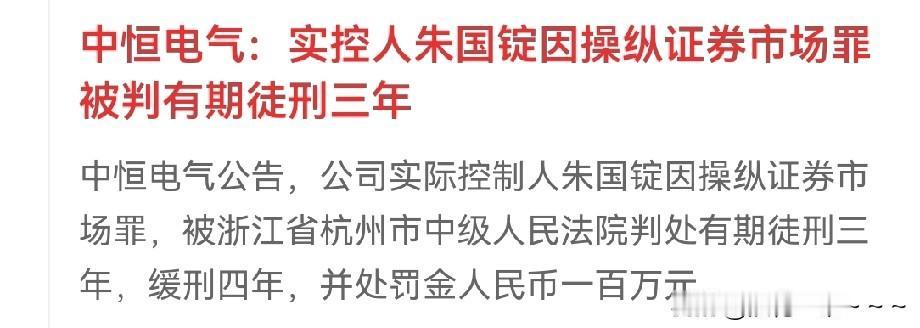 我滴个乖乖!刚刚看到一个公告,中恒电气公告:实控人朱国锭因操纵证券市场罪被判有期徒刑三年。你们说,这是何苦呢?作为一个上市公司的实控人,上百亿的市值,公司也不亏损,而且今年赶上数据中心热点也走得很牛。难道他自己差那么一点钱吗?还来操纵证券?犯下了这么一个大罪坐三年牢值得吗? 当然了,操纵证券市场罪,最倒霉的还是买他公司股票的部分股民啊,因为他违法犯罪了,那肯定是有受害人的嘛。 也可以看出,现在上面上市公司的监管是多么严格,也跟那些上市公司的实控人,董秘,监事,大股东…提了一个醒,要认真落实好上市公司的各项制度规定,不要试图挑战法律。[捂脸]