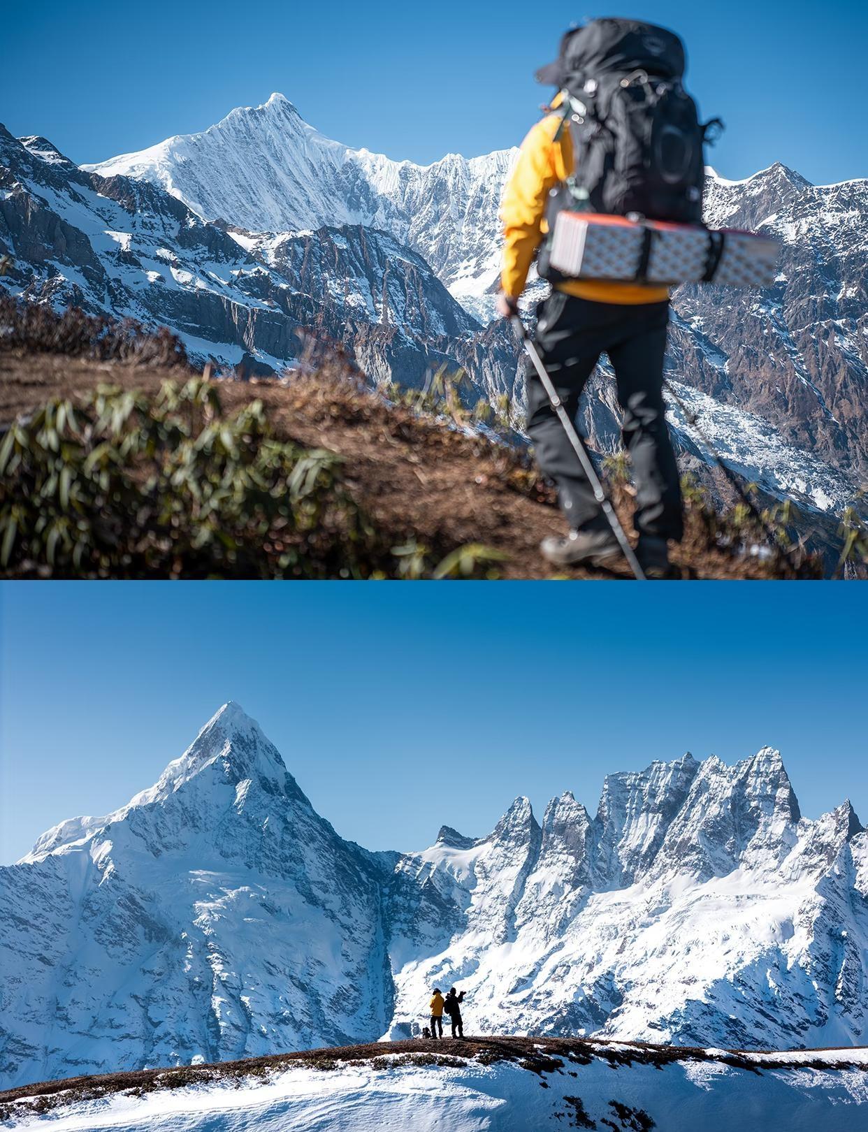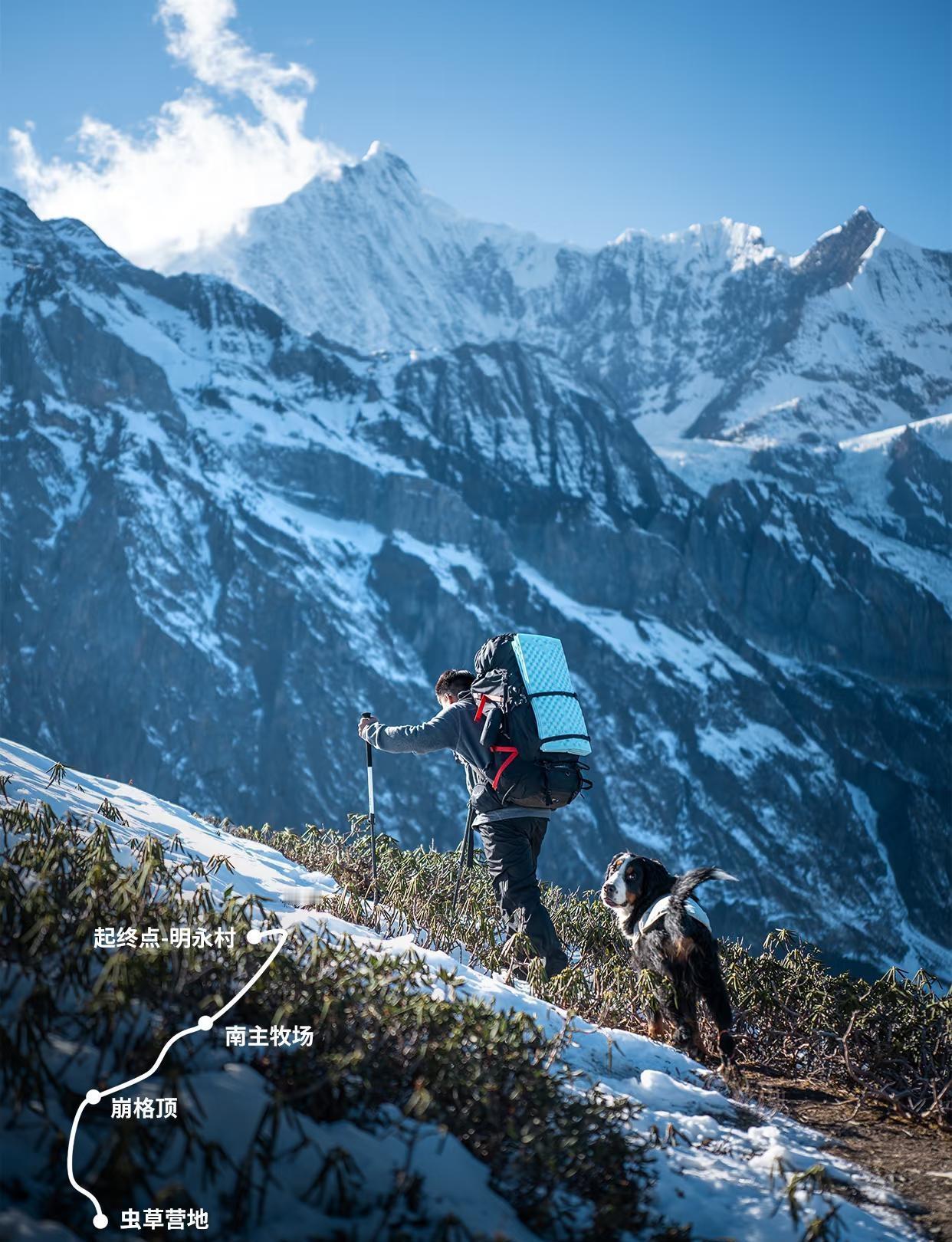 卡瓦格博之心 I 在这里我听到了神山的心跳 打开帐篷那一刻的震撼永远不会忘 这是一条能近距离直面卡瓦格博、缅茨姆、五冠峰的三天两夜徒步路线,可以重装也可以商团轻装。 从明永村或者荣中村出发,海拔爬升2000m,最高海拔4450m,对于没有高海拔重装经验的小伙伴,此条路线需要报商团 交通 香格里拉—德钦/飞来寺:在迪庆交运小程序购买车票,车程约3小时 德钦/飞来寺—明永村:包车拼车前往,车程约1小时 行程 Day1:德钦/飞来寺—明永村—南主牧场 车程约1小时,徒步4公里,海拔爬升1100m,耗时约4小时 南主牧场营地费60/人,营地提供水源 Day2:南主牧场—崩格顶营地 徒步4km,海拔爬升900m,耗时约4小时 此处非牧场,勿交营地费,怕纠缠可在海拔4160处小平台扎营,很推荐在小平台扎营,重装爬升少150m,且风小一点 崩格顶附近无水源,夏季背水上去,冬季可以取雪融水 Day3:崩格顶—虫草营地—南主牧场—明永村—返程 从崩格顶下撤到明永村需要徒步8km,海拔下降2000m,耗时约4小时 轻装虫草营地往返需要额外徒步5.5km,海拔爬升300m,下降300m,往返约3小时 根据体力、时间、积雪、风力、补给等实际情况谨慎选择是否前往虫草营地 注意事项 安全:做好充足计划,合理判断自身能力,此路线可能遭遇的情况比较多需要充足经验,不适合当做第一次高海拔重装路线 高反:有风处戴好冷帽保护头部可以降低高反概率,如遇高反(头疼头晕恶心等症状)千万别硬撑,及时结伴下撤 保暖:1月夜间温度在零下15度左右,保暖衣物及睡袋温标一定要达标,衣服冷了穿热了脱避免失温 地钉:地钉容易被冻土冻上拔不出来,多利用地面已有地钉减少损失 保护环境无痕拔营,垃圾带走 装备清单 拍摄:a7c2、2070、Dji Air3 衣:硬壳衣裤、速干羊毛打底衣裤、抓绒(动态保暖)、羽绒(静态保暖)、冷帽、遮阳帽、面罩、护目镜、防风手套、羊毛袜 食:保温杯、高压锅、集热锅、炉头、高山罐、食材、水、过滤器、路餐、餐具 这次带了两口锅,一来融雪过滤方便,二来煮饭同时能炒菜 住:帐篷、1000充绒睡袋、充气睡垫、充气枕头 行:徒步鞋、重装包、登山杖、冰爪、雨衣 其他:头灯、急救包、卫星电话、猫铲、垃圾袋、暖宝宝、充电宝数据线、防晒霜、纸巾 徒步丈量世界 徒步圈 徒步