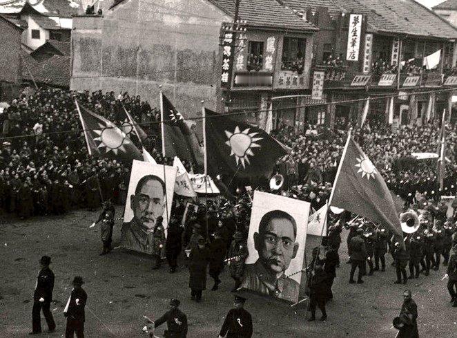 1938年初,武汉三镇举行的盛大阅兵式暨群众游行,纪念孙中山先生逝世十三周年,同时鼓舞全民抗战士气。 照片中,宽阔街道上军乐队在前导奏,队伍高举多面青天白日满地红旗,并抬着两幅巨幅孙中山画像,街道两侧楼房挂满横幅,阳台上、屋顶上站满观看群众,人山人海,气氛热烈庄严。 此时,日军尚未全面进攻武汉,中国军队在台儿庄取得大捷,全国抗战士气高涨。1938年3月12日是孙中山逝世十三周年纪念日,武汉当局特组织大规模阅兵与群众游行,由国民政府军事委员会、政治部与湖北省政府联合举办,参加者包括中央军、桂军、川军等各部部队,以及学生、工人、市民代表,总人数达数十万。