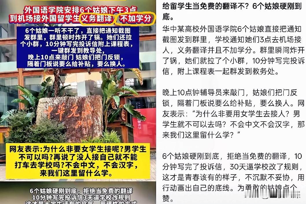 不得不说,这届00后是真有点东西,专治各种“不合理”! 我就纳闷了,现在的学校怎么想的?硬派6个女生去给连中文都不懂的留学生当翻译。咋的?来东方大国留学连句东方大国话都不会说,还得让人伺候着? 也就是00后敢这么干,辅导员来劝都不好使,直接一封投诉信怼上去,硬是逼着学校把这破规矩给改了。 说实话,看得很爽。 换成咱们80、90后,估计就算心里一万个不愿意,还是会为了所谓“大局”忍气吞声把活干了。 看来咱们是真老了,这点儿硬骨头精神,还真得跟这帮孩子学学,凭什么惯着他们?