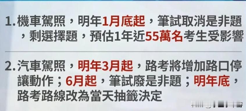 2026年开始,中国台湾省交通部将分阶段调高汽、机车考照难度,回应机车事故长期居高不下的现实,机车驾照笔试将率先动刀,全面取消是非题,只保留选择题,预估一年影响近 55 万名考生。 汽车考照也同步加严,3 月起路考新增路口停让动作,6 月起笔试同样废除是非题,不再让考生靠背答案过关,而是强化对实际交通情境与法规理解的要求。 除了笔试,路考制度也将更贴近真实用路环境,汽车路考路线预计在 2026 年底,改为当天抽签决定,降低事前背路线、临时应付的空间,迫使考生真正具备临场判断与操作能力。