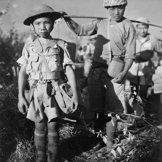 抗日战争时期,一位中国少年士兵(俗称“娃娃兵”),身着军服、佩戴装备,站在野外环境中。看起来约12-14岁,戴着宽大的军帽,穿着过大的军装,背着干粮袋和水壶等物品,表情严肃而稚气未脱。 抗日战争期间,由于连年作战导致兵源严重不足,中国军队在一些地区放宽征兵年龄限制,招募了大量青少年参军。这些“娃娃兵”多为战争孤儿、难民或家庭贫困的孩子,最小年龄有时仅9-10岁。他们最初往往负责后勤工作(如送信、站岗、煮饭),但在战事紧急时也会上前线作战。 这些孩子参军往往出于家仇国恨,许多父母被日军杀害,他们怀着复仇决心投身战场。蒋介石曾多次下令取缔“少年兵”,视其为“国军耻辱”,但在兵源枯竭的现实下难以彻底执行。远征军中的“娃娃兵”更多是军队收容的战争难童,而非正规强征。