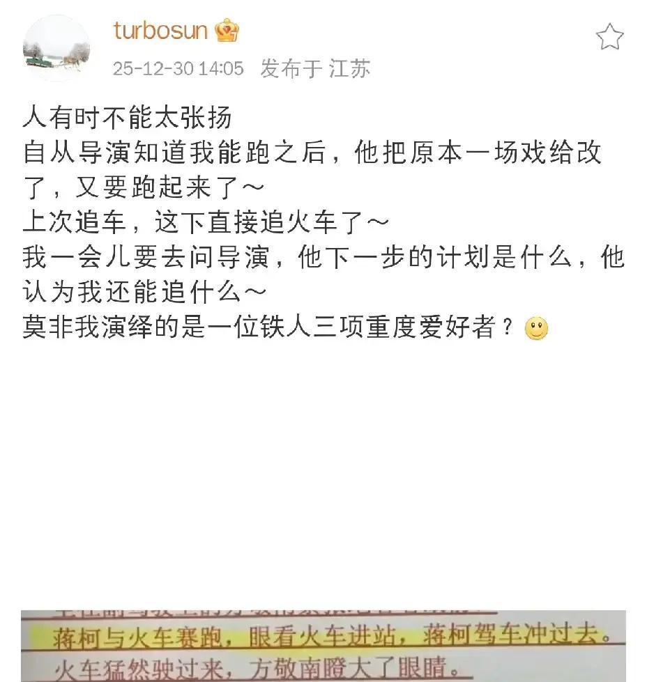 拍动作戏拍到导演崩溃 孙俪昨天发博:跑太快,导演临时加戏。底下热评第一,“姐别跑了,摄影机位跟不上”。 她这次演女警,开机前三个月就拉体能。每天十公里打底,剧组伙食只敢吃水煮鸡胸。导演看她冲刺不带喘,干脆把原本两分钟的追车改成五分钟长镜头。 横店现在零度,她穿单衣连跑八条。现场工作人员说,收工时鞋底磨穿,膝盖肿得裤子脱不下。 想起吴京拍战狼,也是潜水好被加戏,最后剪出八分钟水下长镜头。好演员拼命,导演才敢赌。 观众最后看到的爽,是演员拿命换的。