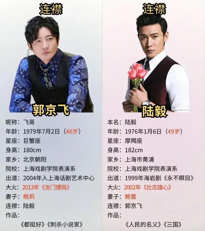 姐夫比姐夫大3岁,俩老婆是亲姐妹! 郭京飞在《老舅》里娶了王佳佳,现实里真老婆是哈尔滨人鲍莉,只比他小一岁。鲍莉的姐姐是鲍蕾,也就是陆毅的老婆。上海黄浦的陆毅,娶了黑龙江姑娘;黑龙江的郭京飞,娶了上海长大的鲍莉,南北调了个个儿。 陆毅早红,郭京飞晚成,家里刚好错开档期。一个带娃,一个拍戏,轮着上。今年更巧,郭京飞的《追风者》收视一路飙,陆毅的《大唐狄公案》也稳占黄金档。亲戚群里天天比谁更火,丈母娘最省心:女婿轮流赚钱,女儿轮流顾家,红包翻倍收。 换你,想不想也找个连襟错峰上班?