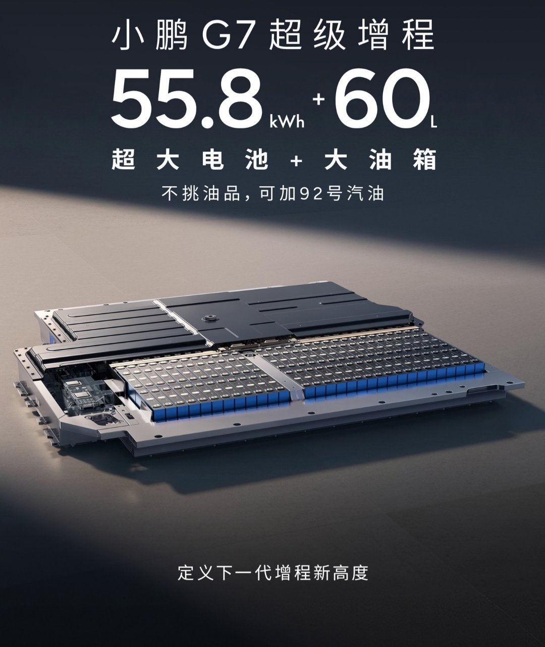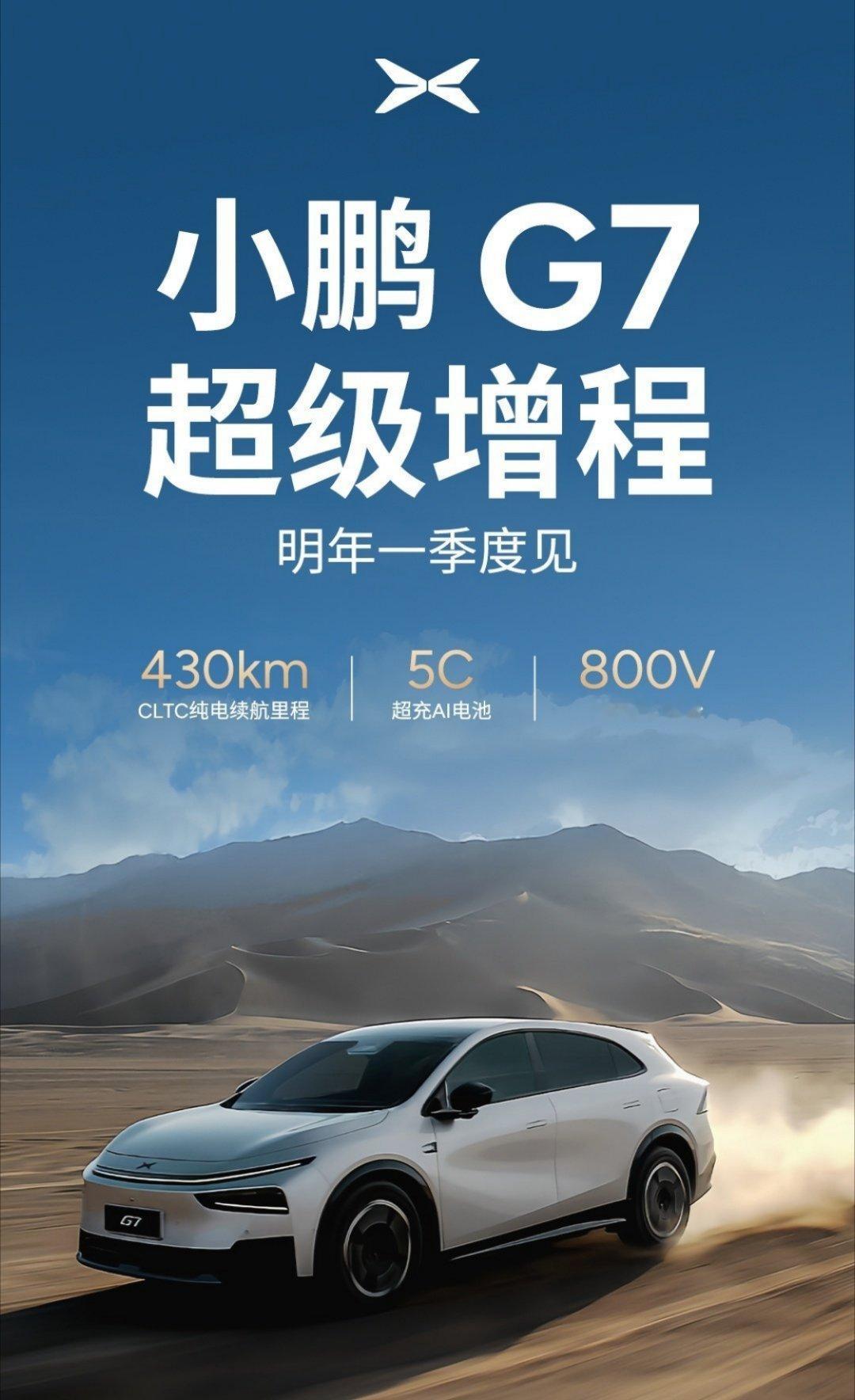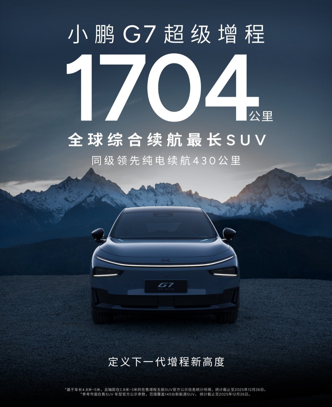 【小鹏 G7 超级增程 SUV 登场,综合续航做到全球最长 1704 公里】小鹏汽车董事长何小鹏今日宣布,小鹏 G7 超级增程 SUV 正式登场。这是小鹏鲲鹏超级增程家族推出的首款 SUV 车型,把综合续航做到了全球最长的 1704 公里(55.8kWh 电池 + 60L 油箱,可加 92 号汽油)。据介绍,小鹏 G7 超级增程 SUV 拥有 430 公里纯电续航,配备同级唯一 800V + 5C 超充 AI 电池;搭载自研图灵芯片,有效算力 2250TOPS,并拥有“豪华舒适配置”和“远超同级的超大空间”。何小鹏微博原文如下:据IT之家此前报道,今年 9 月 12 日,何小鹏在微博发文称,小鹏 G7 超级增程计划于明年第一季度正式跟大家见面。工信部信息显示,小鹏 G7 率先申报了驱动电机 218kW、纯电续航 325km 的增程版 G7,其外观造型与目前在售的小鹏 G7 纯电车型保持一致,定位为中型 SUV。作为参考,小鹏 G7 纯电版的指导价区间为 19.58 万 - 22.58 万元。小鹏 G7 增程版在设计上延续了纯电版车型的“Robot Face”前脸风格,将贯穿灯带与分体式大灯进行了巧妙融合,头灯两侧还新增了通风口设计,前机舱盖上也加入了隆起的筋线,整体造型更具力量感和科技感。新车在前翼子板处装配了侧后向摄像头,还配备了隐藏式门把手、悬浮式外后视镜等设计细节。同时,小鹏 G7 增程版将提供三种字母“X”型轮辋造型以及熏黑刹车卡钳供消费者选择,并申报了 235/55 R19 和 255/45 R20 两种轮胎规格。小鹏 G7 增程版的长宽高分别为 4918/1925/1655mm,轴距为 2890mm。与小鹏 G7 纯电版(长宽高分别为 4892/1925/1655mm,轴距为 2890mm)相比,增程版车型的车身长度增加了 26mm,而其他数据则保持不变。