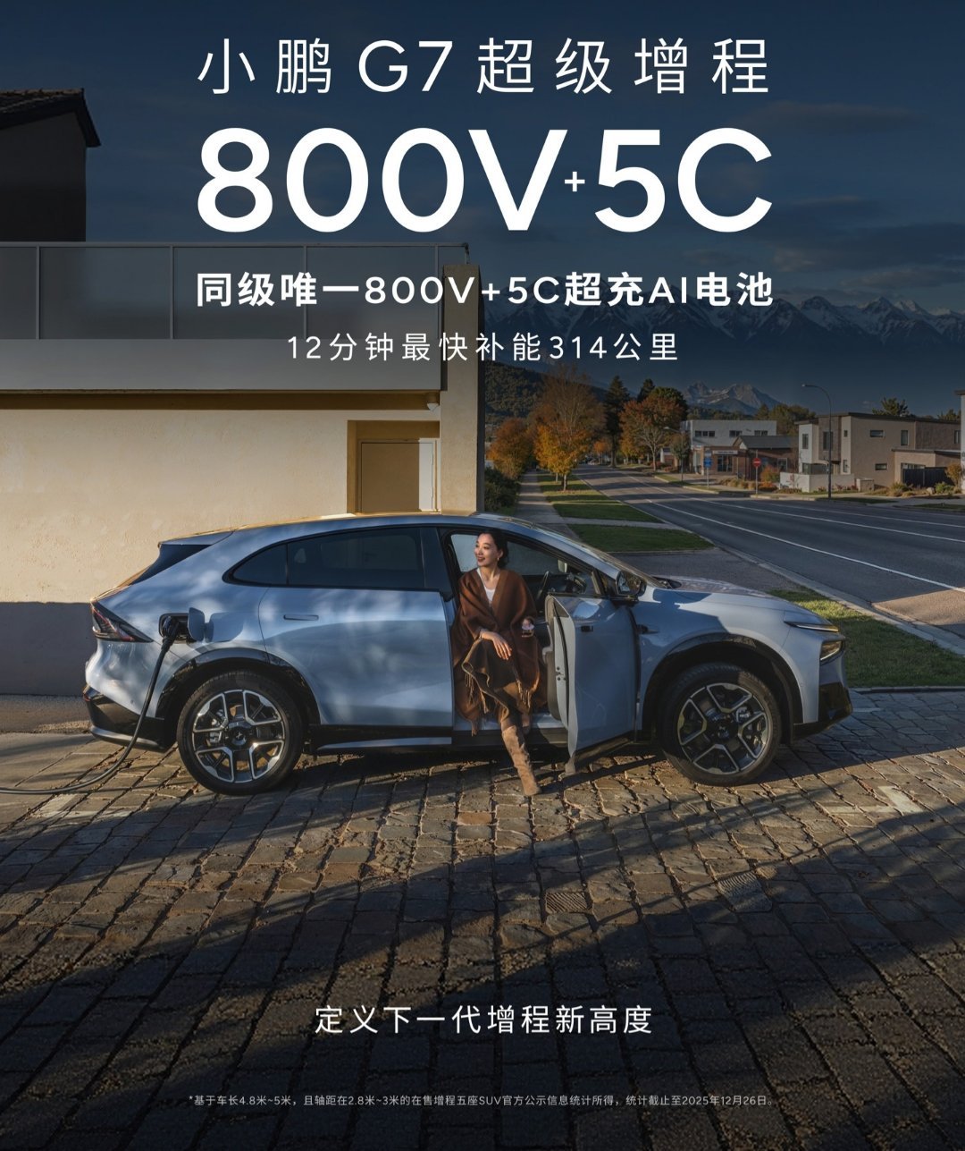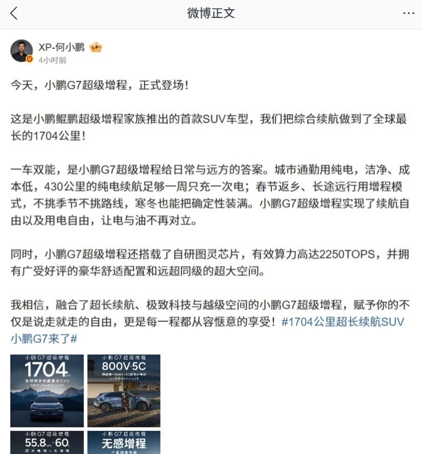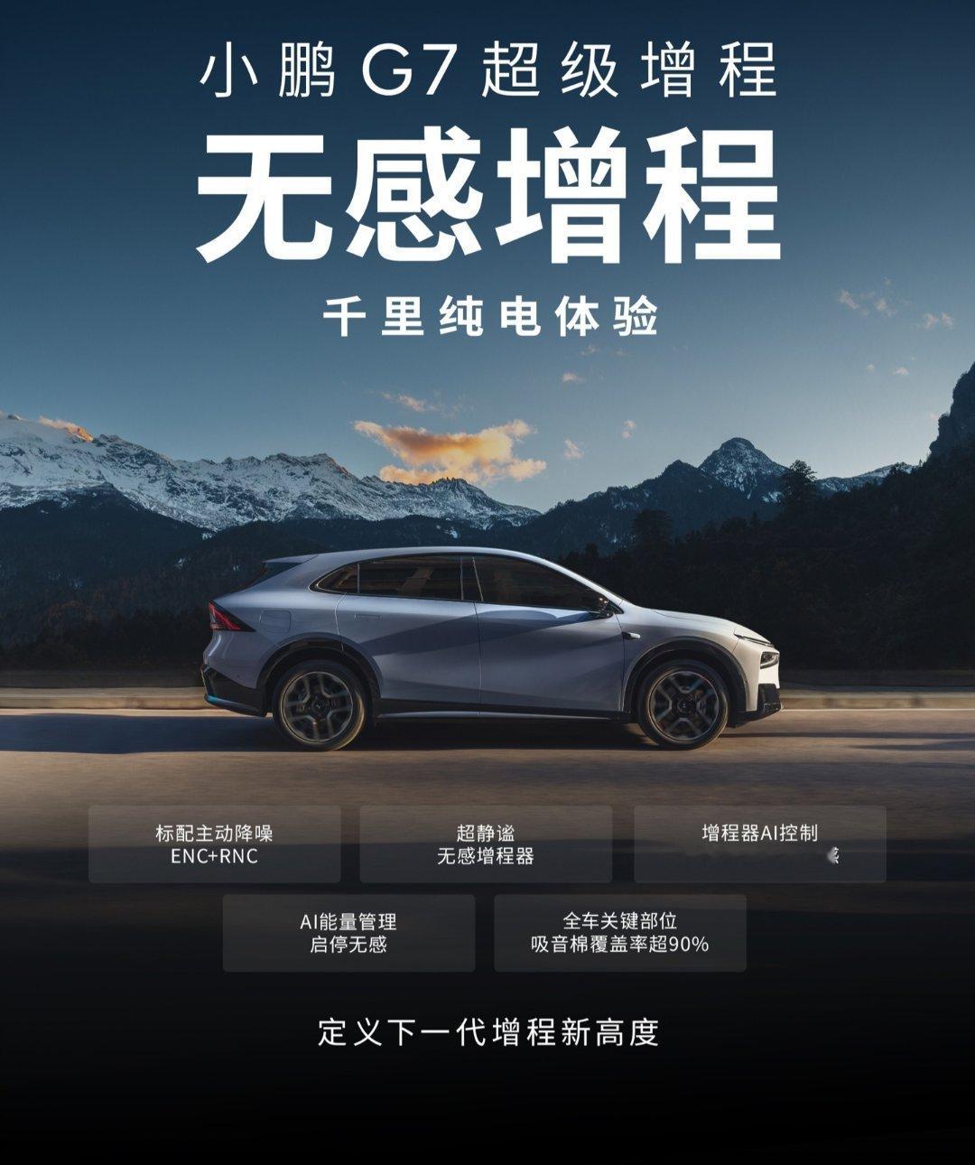 【小鹏 G7 超级增程 SUV 登场,综合续航做到全球最长 1704 公里】小鹏汽车董事长何小鹏今日宣布,小鹏 G7 超级增程 SUV 正式登场。这是小鹏鲲鹏超级增程家族推出的首款 SUV 车型,把综合续航做到了全球最长的 1704 公里(55.8kWh 电池 + 60L 油箱,可加 92 号汽油)。据介绍,小鹏 G7 超级增程 SUV 拥有 430 公里纯电续航,配备同级唯一 800V + 5C 超充 AI 电池;搭载自研图灵芯片,有效算力 2250TOPS,并拥有“豪华舒适配置”和“远超同级的超大空间”。何小鹏微博原文如下:据IT之家此前报道,今年 9 月 12 日,何小鹏在微博发文称,小鹏 G7 超级增程计划于明年第一季度正式跟大家见面。工信部信息显示,小鹏 G7 率先申报了驱动电机 218kW、纯电续航 325km 的增程版 G7,其外观造型与目前在售的小鹏 G7 纯电车型保持一致,定位为中型 SUV。作为参考,小鹏 G7 纯电版的指导价区间为 19.58 万 - 22.58 万元。小鹏 G7 增程版在设计上延续了纯电版车型的“Robot Face”前脸风格,将贯穿灯带与分体式大灯进行了巧妙融合,头灯两侧还新增了通风口设计,前机舱盖上也加入了隆起的筋线,整体造型更具力量感和科技感。新车在前翼子板处装配了侧后向摄像头,还配备了隐藏式门把手、悬浮式外后视镜等设计细节。同时,小鹏 G7 增程版将提供三种字母“X”型轮辋造型以及熏黑刹车卡钳供消费者选择,并申报了 235/55 R19 和 255/45 R20 两种轮胎规格。小鹏 G7 增程版的长宽高分别为 4918/1925/1655mm,轴距为 2890mm。与小鹏 G7 纯电版(长宽高分别为 4892/1925/1655mm,轴距为 2890mm)相比,增程版车型的车身长度增加了 26mm,而其他数据则保持不变。