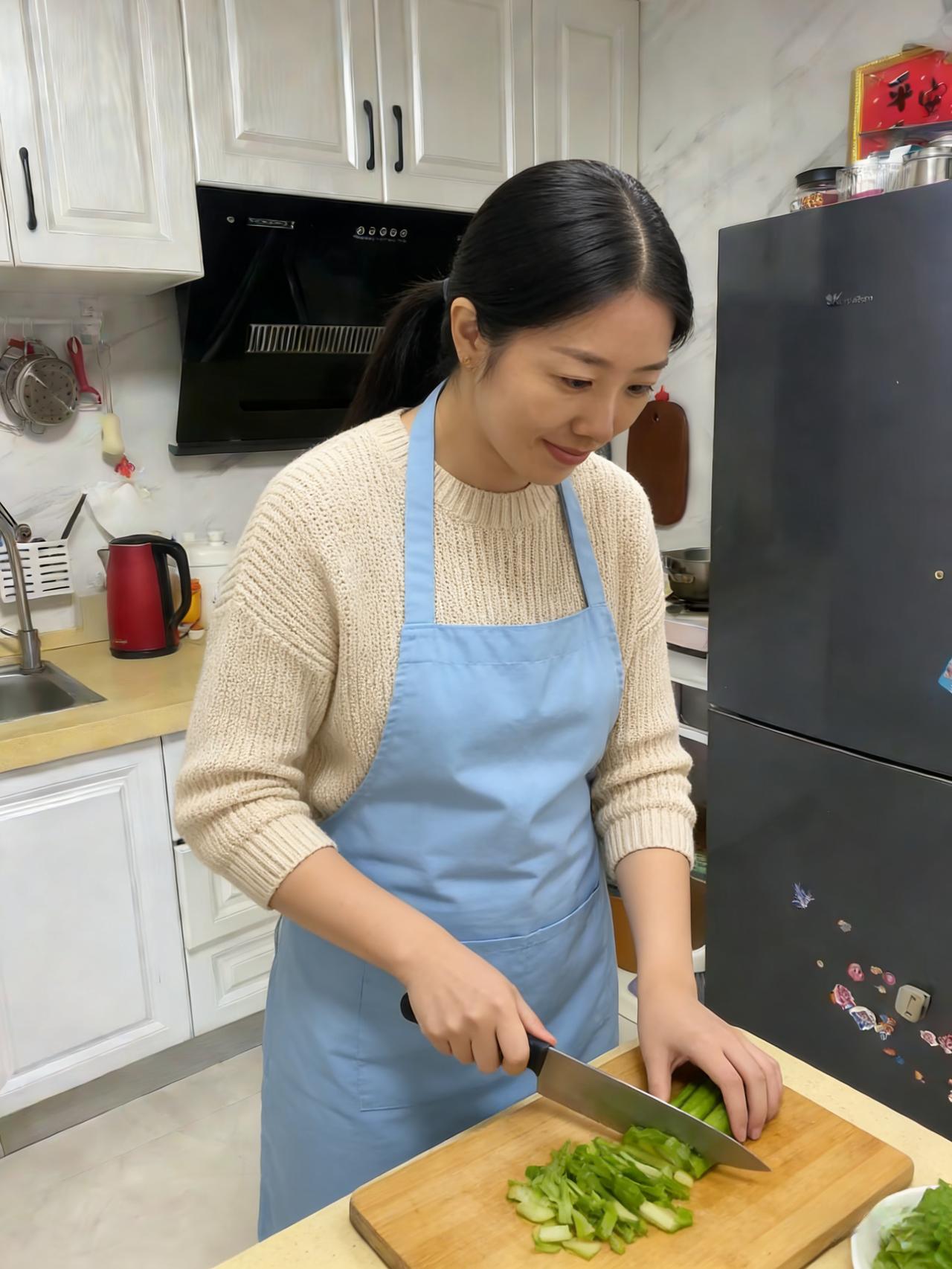 娇妻亭亭立灶旁,盘盘美味溢清香。 何须玉馔添华彩,家常滋味胜琼浆。