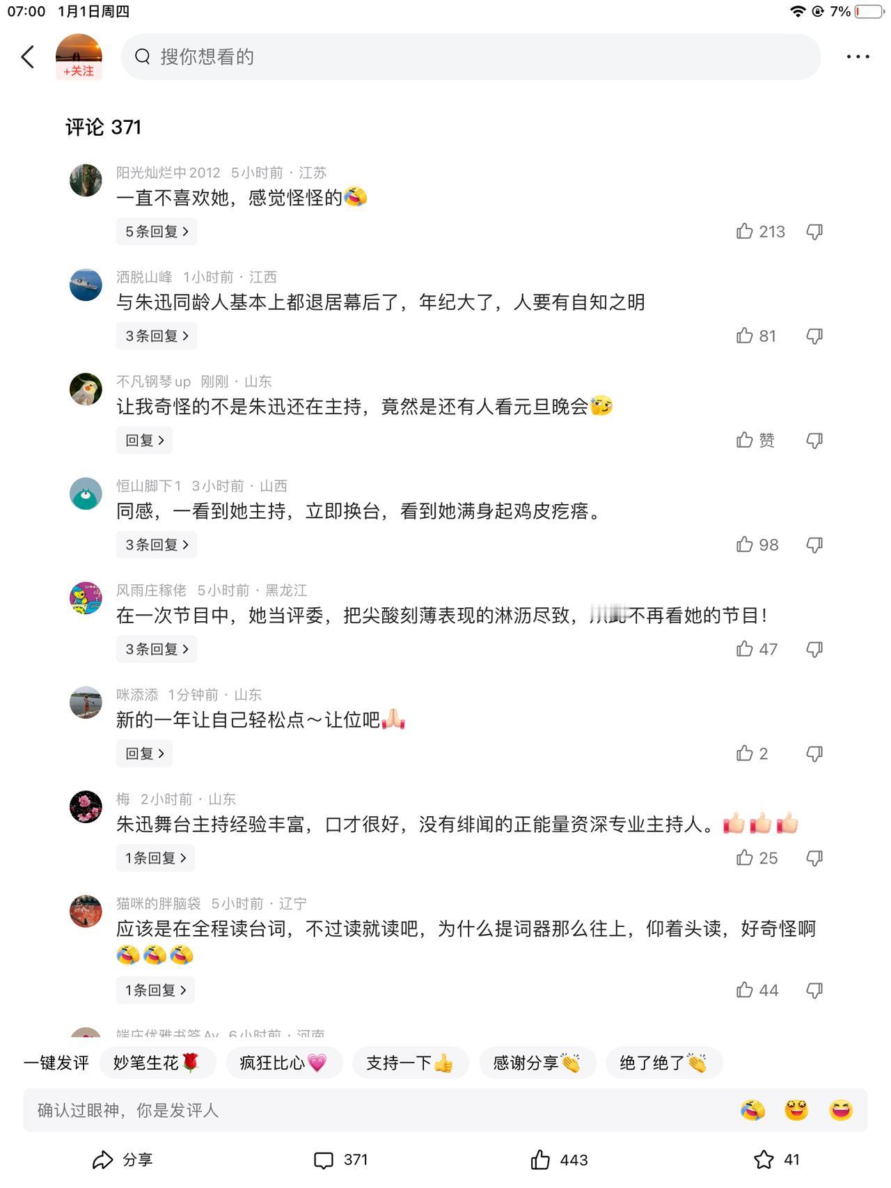 朱迅也老了,央视能不能别让她出来主持大型晚会儿了,眼睛一直往上瞟,视觉效果真的很差。岁数大了退居幕后不行吗?离了谁都能转的不是吗?当年的倪萍,周涛董卿都可以离线,朱迅非得当劳模吗? 不可能只有我一个人不是那么爱看她吧!实在不行去直播带货吧!李思思都去了。挣得多,还只膈应看的人。