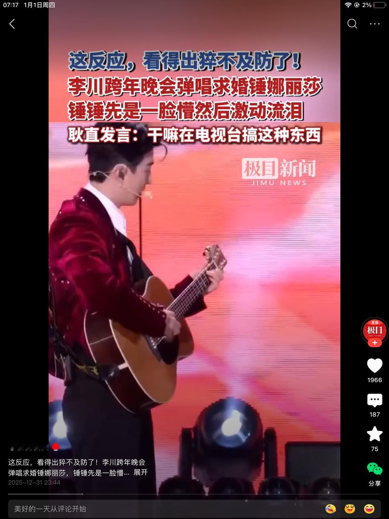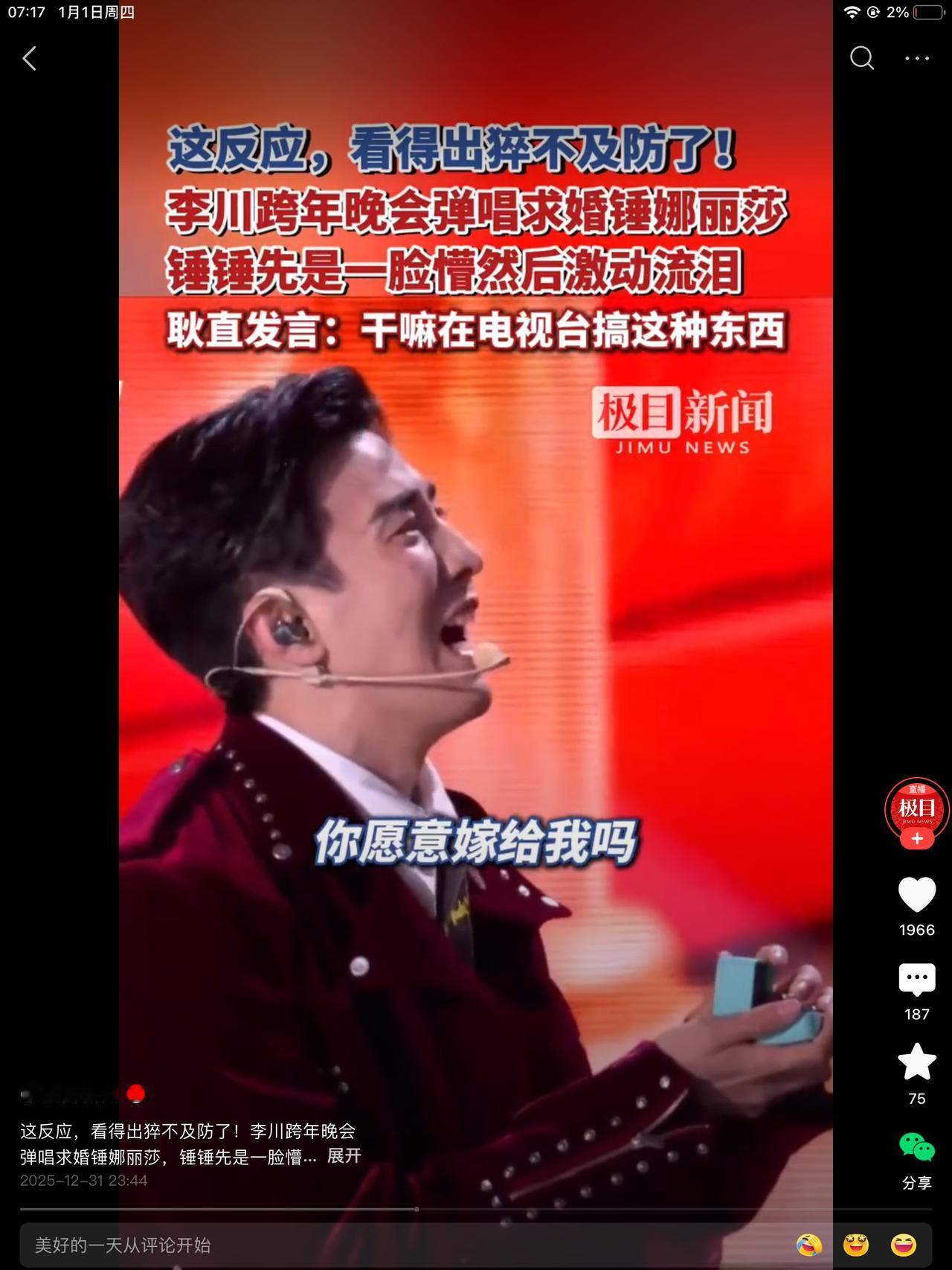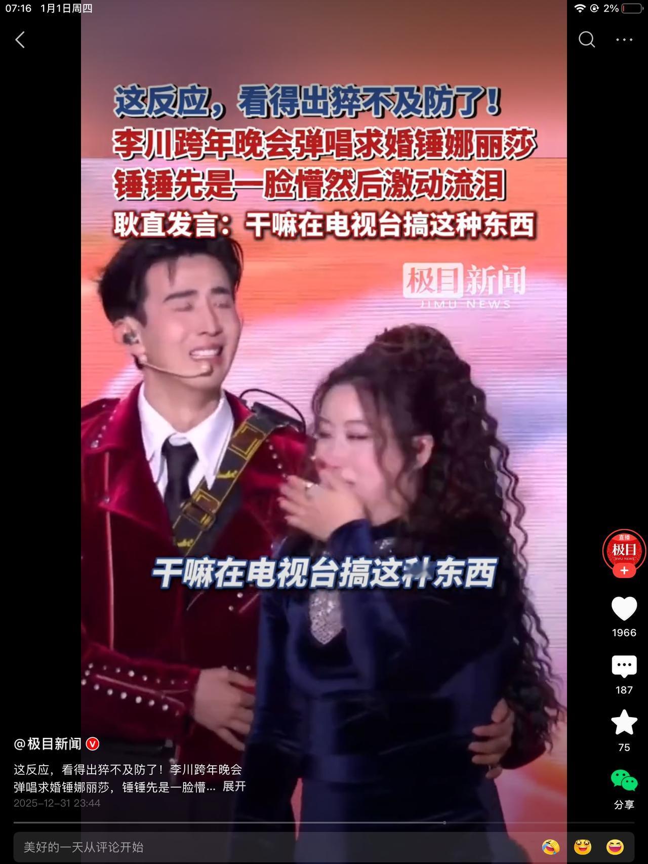 李川求婚锤娜丽莎成功。正如锤锤所言,干嘛在电视台搞这种东西。不想看。只想听歌,看晚会。谁来都油一把,腻歪死了。岁数大了,不愿意看这种东西。除非自己的亲人,没办法,凑数也得去。这几年都断亲了,谁也不想搭理谁。 再说了,胡一菲怎么想,谁的现任不是谁的前任,前任躲被窝里躺着,那眼泪,掉也不是,不掉也不是。跨年夜,出来膈应人。沉浸在自己的世界里,不管别人的死活。真讨厌。哈哈😄 上一对胖对瘦的,还是郑少秋和肥姐。肥姐也是,幽默极了。秋官儿可不是和好丈夫和好爹。人啊,就那回事吧!