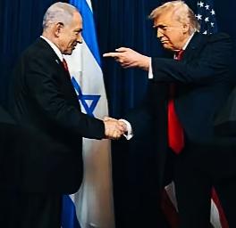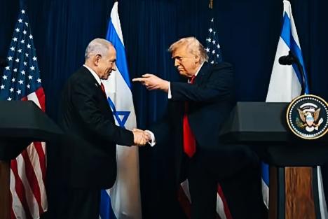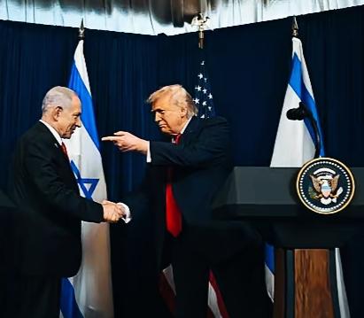 特朗普和内塔尼亚胡握手时,另一只手的姿势是什么意思呢? 特朗普这手势是指向什么呢? 内塔尼亚胡面对特朗普这表情和手势,不知理解特朗普这是什么意思呢?
