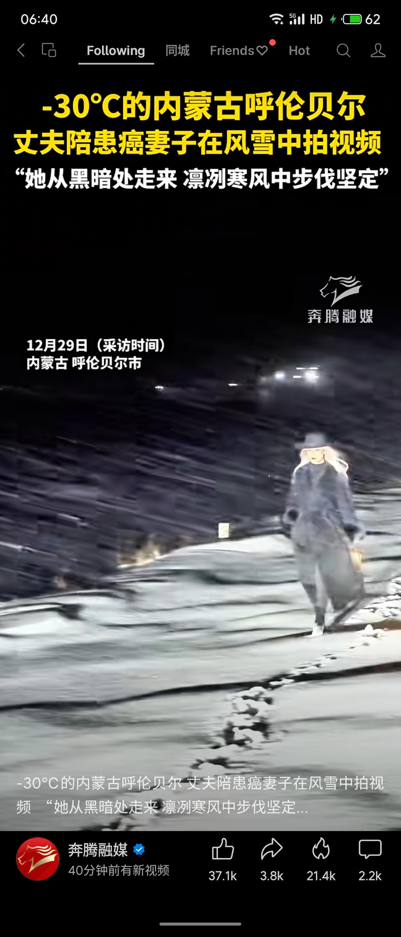 内蒙古呼伦贝尔零下30度的风雪中,丈夫陪伴处于鼻咽癌恢复期的妻子拍摄视频。镜头里,她从暗处坚定走来,凛冽寒风映衬着抗争疾病的勇气与相守的温暖。