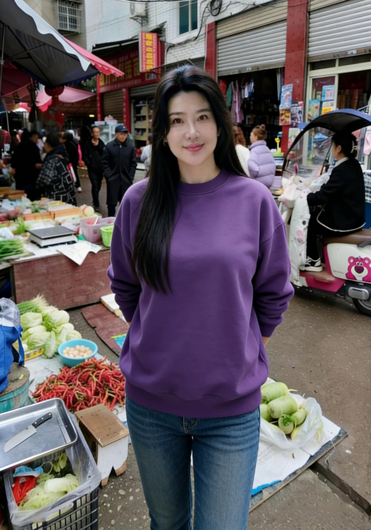 紫衫轻覆玉肌柔,立尽市集风满眸。 烟火人间藏秀色,一颦一笑胜清秋。
