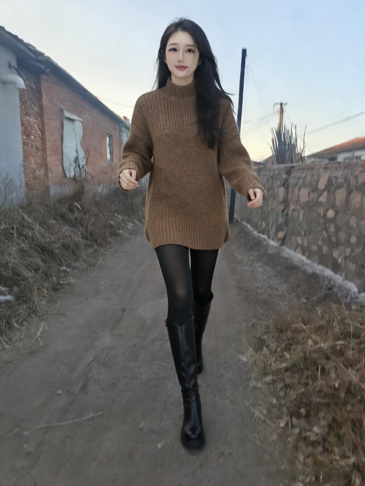 乡陌霜轻步影长,焦糖衫色衬晨阳。 青丝漫卷风前絮,黑袜斜依石畔墙。 长靴踏碎寒阶雪,浅笑融开野径霜。 莫道村途无胜景,佳人一顾满春光。