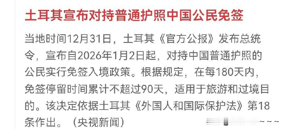 快讯! 土耳其🇹🇷也盯紧了中国游客的口袋? 竟然去年最后一天宣布对此普通护照中国公民免签。 看来土耳其国家也知道中国公民口袋里有钱啊!知道我们喜欢去外面旅游喜欢,赶紧抢夺游客资源!而且给的时间相当长,在180天内,免签停留累计不超过90天。 你们别说,对喜欢旅游的人来说真是一大好事,省了多少办签证的心啊?土耳其烤肉特别有名,伊斯坦布尔景点全世界有名,咖啡奶酪你也可以去品尝一下。