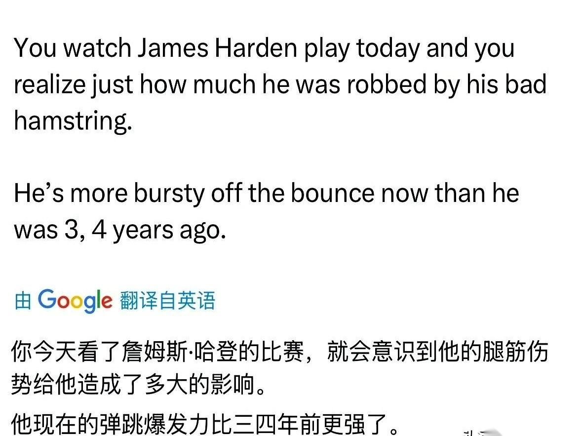 那根腿筋,到底藏着多少委屈和骂名? 所有人都以为那是他的终点。 没想到,是新篇章的序言。 那几年,铺天盖地的“巅峰已过”、“断崖下滑”,好像全世界都等着看他笑话。 把一个曾经的MVP,贬得一文不值。 怪谁呢?怪伤病?怪那个让他戴着镣铐跳舞的体系? 现在这事儿越来越清楚了。 你看他现在在快船的第一步,那启动速度,那爆发力,说比三四年前还猛,真的一点不夸张。 他不是找回了状态。 他是一直有这个能力,只是被那该死的伤病和不合适的环境给“封印”了。 最有意思的是什么? 是韦德、是阿里纳斯这些真正站在山顶看过风景的人,都站出来说,“嘿,你们看走眼了,这才是他。” 反倒是一帮连球都没摸过的人,天天在网上指点江山。 这事儿其实跟篮球没太大关系。 这就是人生啊。 在你被误解、被低估、被所有人按在地上摩擦的时候,别吵,别闹。 你就憋着一口气,把自己的事做好。 时间会替你说话,赛场会给你正名。 他不是变强了,他只是终于,又可以做回那个哈登了。