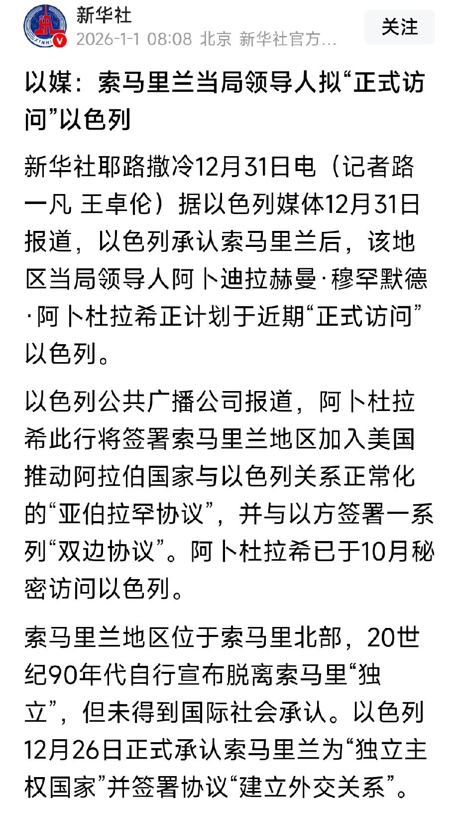 索马里兰领导人准备近期正式访问以色列。 以色列承认索马里兰后,该地区当局领导人阿卜迪拉赫曼·穆罕默德·阿卜杜拉希正计划于近期“正式访问”以色列。 绝不干涉他国内政是基本原则。