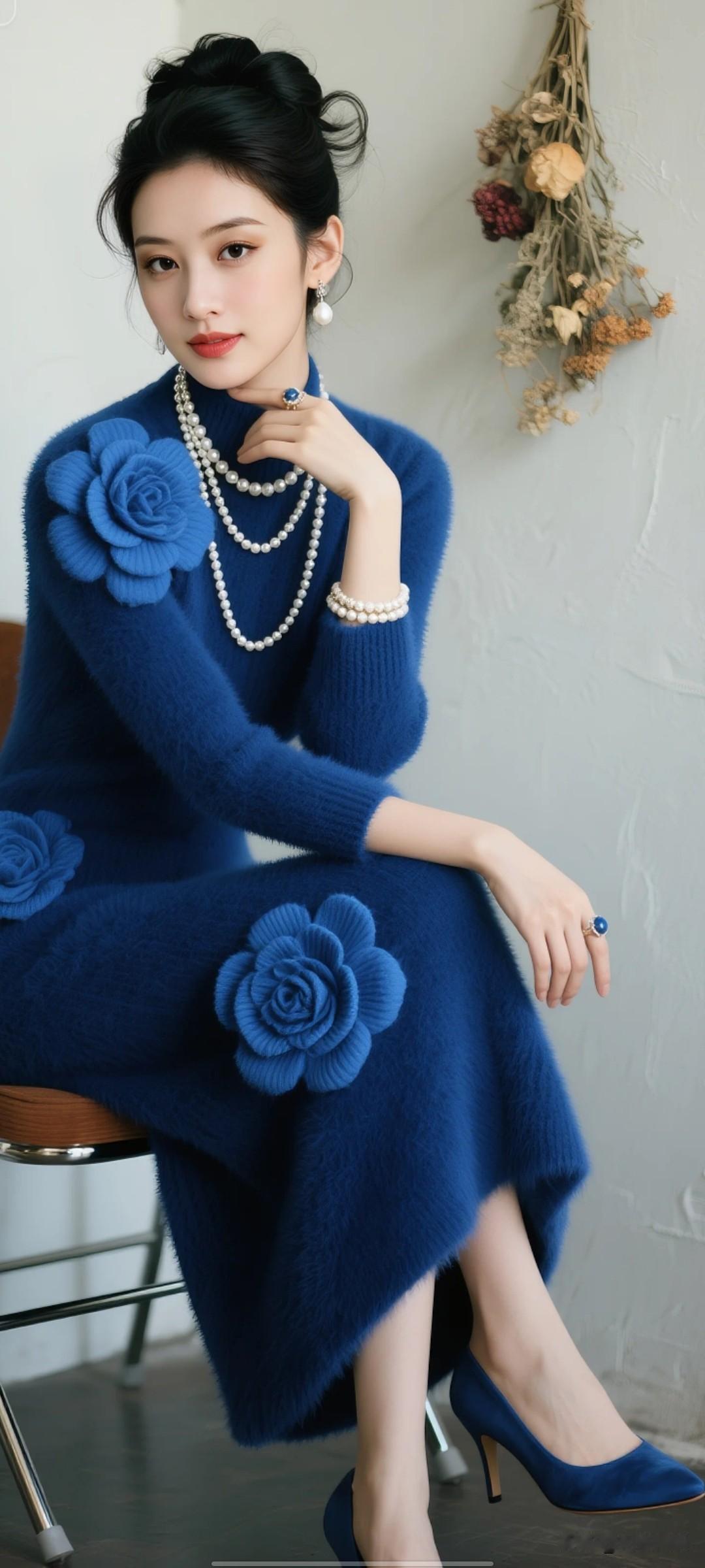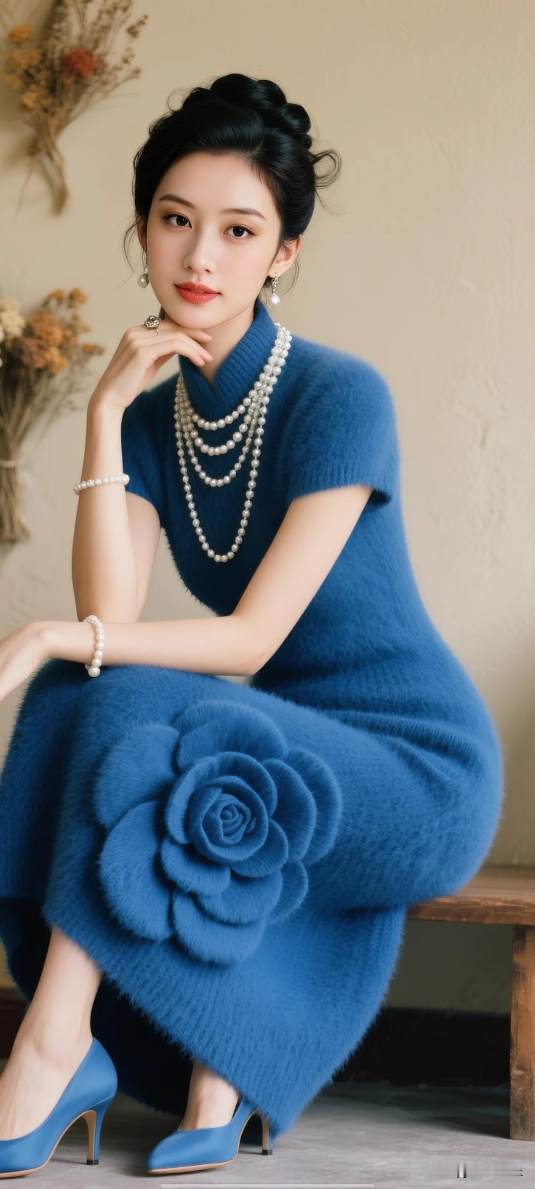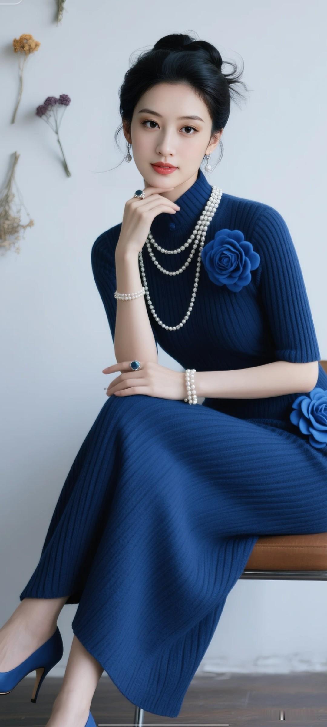 东方美女,绝色佳人,温柔漂亮,高盘发,微乱,发丝清晰边缘有光泽,面部妆容精致,眉形舒展,眼妆柔和,唇涂正红色口红,五官端庄大气。身着深蓝色毛绒质感的针织长裙,裙身装饰有立体深蓝色花朵造型;脚穿同色系高跟鞋,搭配多层珍珠项链、珍珠耳环、珍珠手链与戒指,配饰精致华贵,整体造型优雅且富有质感。 她嘴角轻扬,冷白皮,鹅蛋脸,大眼睛,眼神妩媚温柔,呈现出温婉的微笑,眼神平和且带着从容的笑意,手部轻托下巴的姿态增添了优雅与恬静的气质,整体神情显得端庄、温柔又自信凳坐在椅子上。 背景 墙上挂着干花装饰 高清影视级别全身照