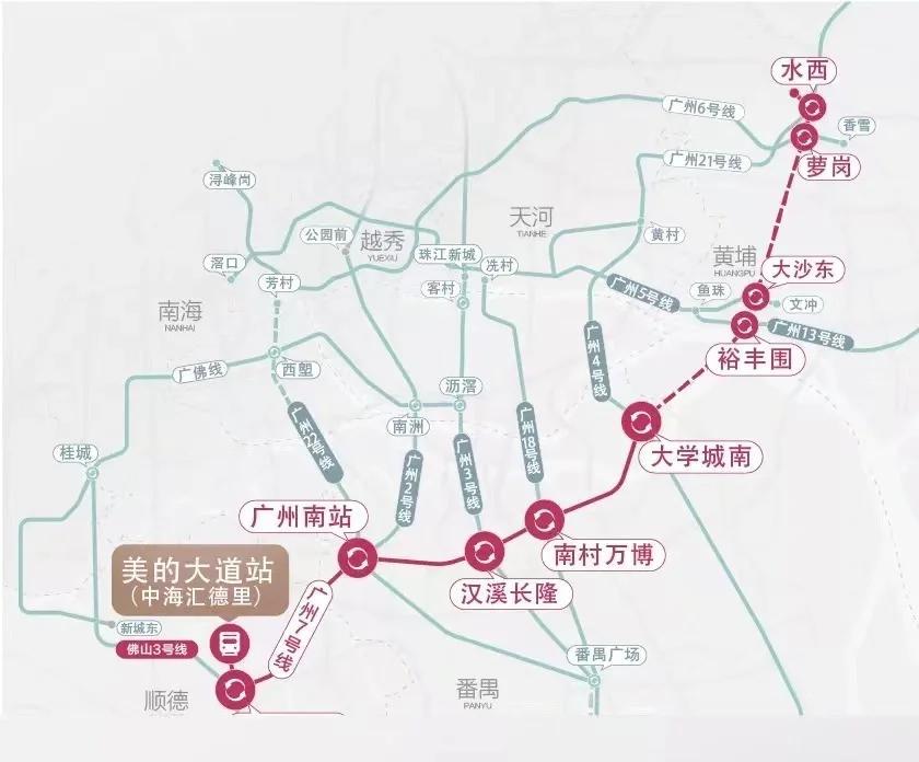 广州7号线延伸到佛山 广州地铁7号线起于美的大道站,途经佛山市顺德区、广州市番