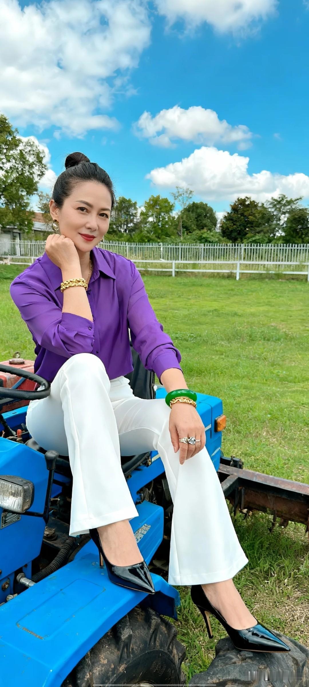 晒图笔记大赛户外场景,女子头发束起,身着紫色透视长袖衬衫,搭配白色喇叭裤与黑色尖头细跟高跟鞋,佩戴绿色手镯、金色手链、戒指,坐姿于蓝色农机设备上。背景是绿草、树木、蓝天白云及远处的建筑与围栏,整体氛围充满户外的个性时尚感。