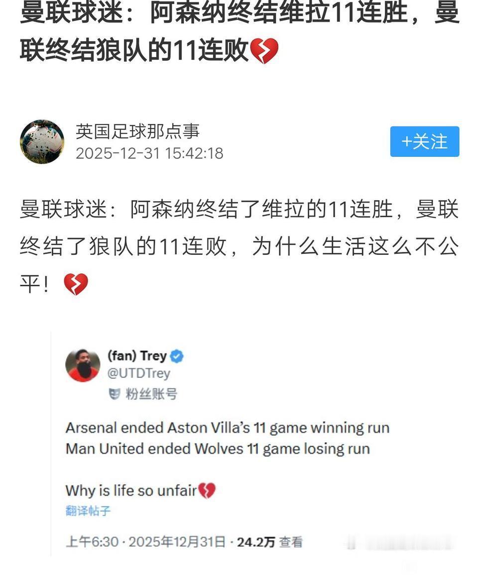 阿森纳终结维拉11连胜,曼联送温暖阻止狼队11连胜。 如果这样下去,2026年曼联死对头阿森纳将拿英超冠军,曼联球迷真倒霉呀。 阿森纳时隔22年夺冠,曼联会时隔多少年? 现在英超冠军越来越难拿,豪门里面利物浦30年一冠是纪录,不会那么惨吧。[思考]