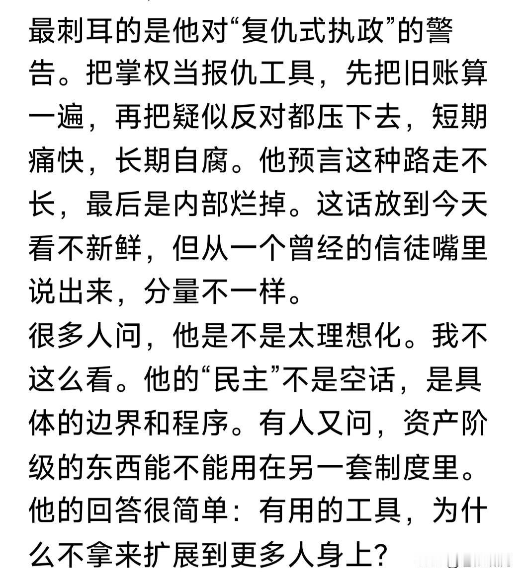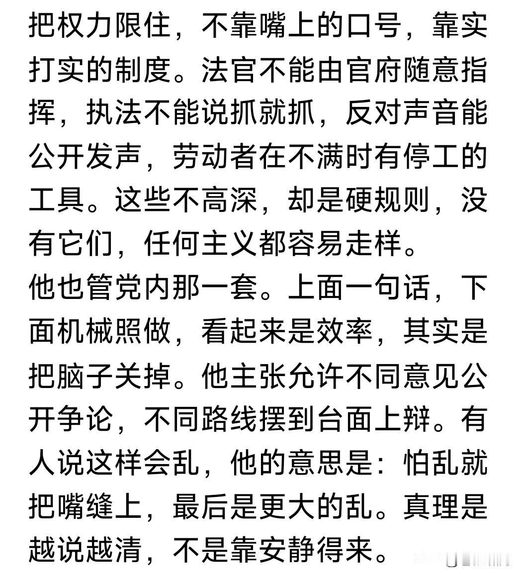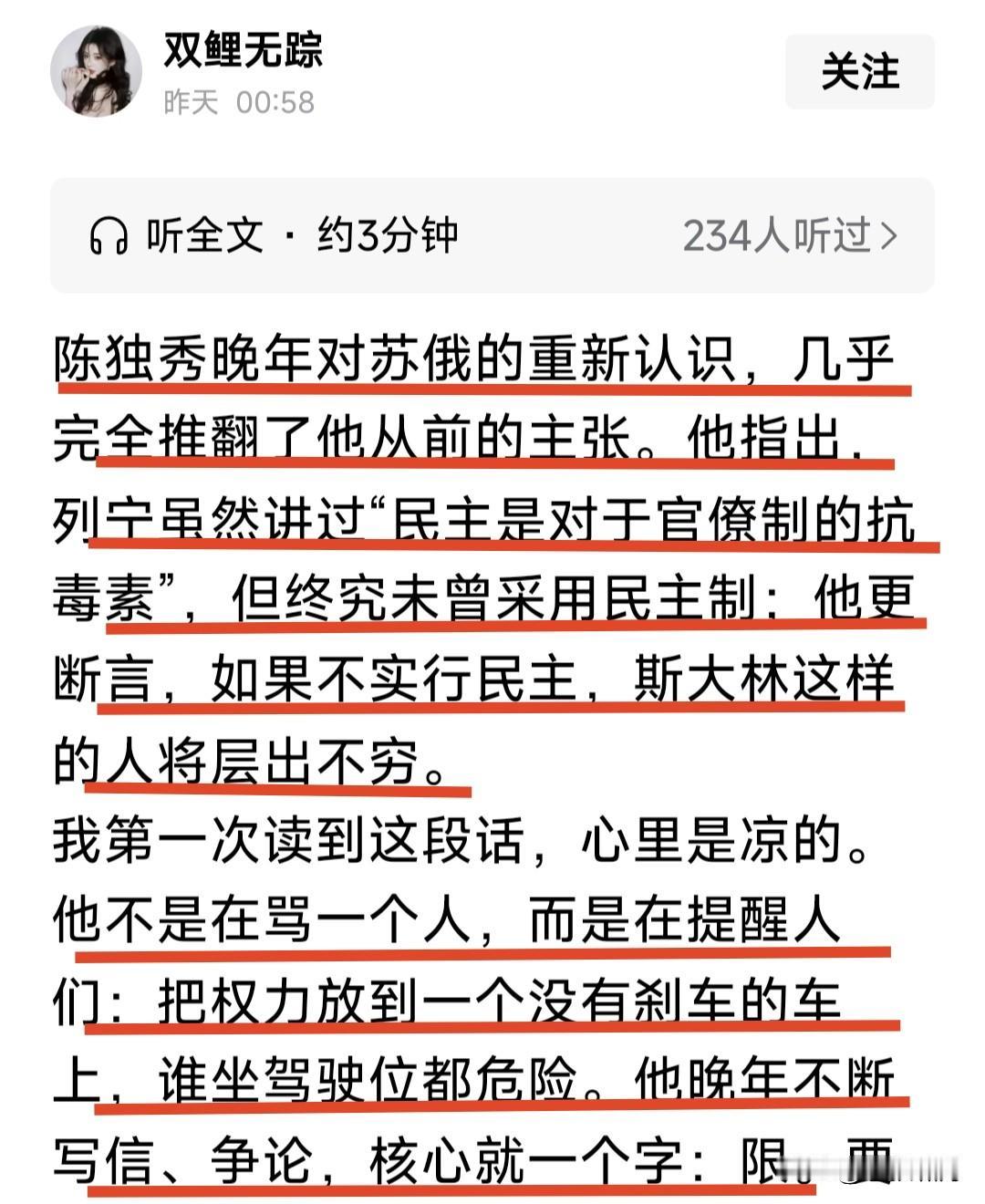 致敬陈独秀!看到他说的一段话,令人十分震动!这段话推翻了他曾经的主张,对苏联体制有了更清醒认知! 列宁曾指出:苏联的最大问题,是没有实现真正的“民主集中制”!他认为:民主是对官僚制的“抗毒素”,如果不实行民主制,斯大林这种人会层出不穷! 但不知为什么?作为苏联的创始人,列宁为何没有落实“民主制”?致使斯大林掌权后,权力无人限制。赫鲁晓夫曾想改变现状,却被勃列日涅夫扼杀。 自此延续下去,苏联权力膨胀,国家政治膨胀!对内腐败堕落,盘剥百姓;对外与美争雄,争夺世界霸权,欧非拉丁与中东,处处针锋相对耗空国家。 戈尔巴乔夫曾想改变苏联,但已病入膏肓积重难返!叶利钦想甩加盟国包袱,阻止戈氏大力改革,最终导致苏联崩溃解体。谁之过谁之罪?懂者自懂。 作为我党创始人之一的陈独秀,思想能有如此大的跨越,令人难以想象!说明他是一个清醒睿智目光远大的人。 由陈独秀想到马克思!他也是一个清醒者。我们都知道他三大思想体系:哲学/政治经济学/科学社会主义,对世界影响很大,尤其资本论,更是如此。 但有谁知道,马克思晚年意识到其理论的局限性?又提出“民主法治高于王权”“自由是社会进步条件”的观点呢!只是由于早逝,未能完成两大体系。 再由陈独秀与马克思,想到中国新文化运动!当年思想文化先驱,陈独秀李大钊鲁迅胡适等人提出“民主科学”呐喊,为中国走向光明指明前行方向! 在此迎新辞旧时刻,苍狼再次向陈独秀李大钊鲁迅胡适等思想文化先驱,致以崇高敬意!也祝福我们的国家承前启后继往开来,繁荣昌盛走向富强! …………