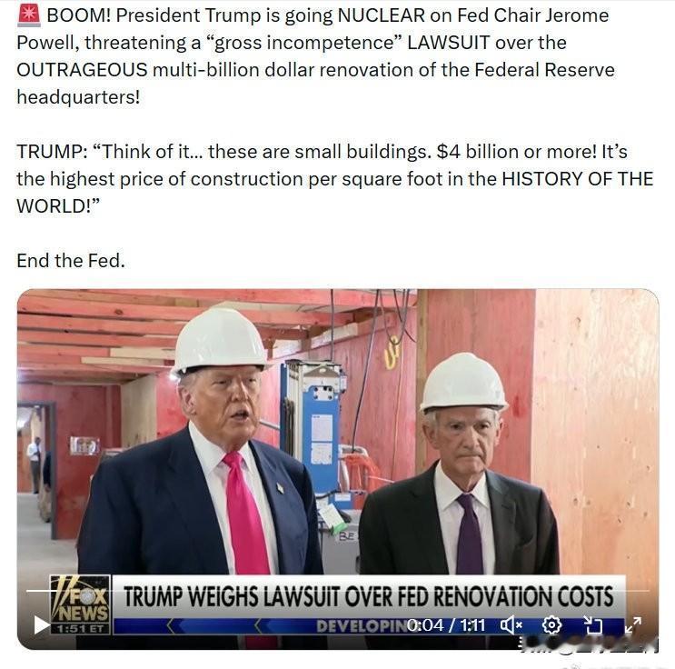 特朗普总统以“严重失职”对美联储主席杰罗姆·鲍威尔提起诉讼! 特朗普:“想想看……这些都是小型建筑。花费竟超40亿美元!这是世界历史上每平方英尺建筑费用最高的记录!”