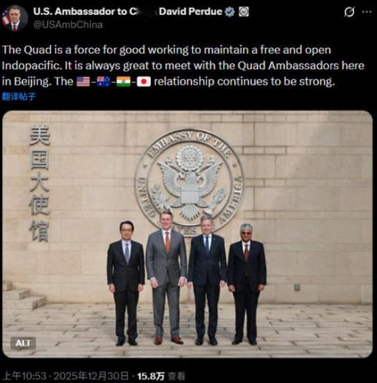 特朗普叫来三大帮手,在北京顶风“作案”,为明年访华埋下祸根   “这边解放军的炮声刚响,那边美国人的小会就开起来了”—— 这话用来形容最近台海局势再贴切不过。   12 月 29 日,解放军东部战区刚打响 “正义使命 - 2025” 环台军演,第二天美国驻华大使庞德伟就带着日本、印度、澳大利亚三国大使,在北京的美国大使馆里凑了个局,美其名曰 “四方安全对话” 大使会议。   庞德伟还特意在社交媒体上晒出四人并肩的合照,配文里把美日印澳四国国旗挨个打上,高调宣称要维护 “自由开放的印太地区”,强调四国关系 “稳固强劲”。   明眼人都看得出来,这哪儿是开什么合作会议,分明是在中国眼皮子底下秀肌肉,对着台海方向刷存在感。   要知道,这次军演可不是走过场,解放军直接摆出 “三面围岛” 的架势,5 个演习区域把台岛裹得严严实实,连 “台独” 分子的弹药库、指挥点都纳入了火力覆盖范围,摆明了是惩戒 “台独” 和外部干涉的硬核警告。   牵头搞事的美国,一边派大使在北京组局,一边还在给 “台独” 递刀子。就在军演前几天,特朗普政府刚批准了 110 亿美元的对台军售,里面的 “海马斯” 火箭炮射程能直接打到大陆沿海。   可转头特朗普又对着媒体说 “自己和中方关系很好,不担心台海局势”,这种两面三刀的操作,活像既想伸手抢好处,又怕被打疼的无赖。   再看庞德伟拉来的三个 “帮手”,其实个个都有自己的小算盘。日本前阵子刚因涉台错误言论被中方反制,经贸合作遭了不少损失,这会儿跟着美国站台纯属硬撑;澳大利亚更务实,和中国的铁矿石、葡萄酒贸易刚回暖,根本不敢真的撕破脸。   印度就更别提了,之前因为内部分歧,Quad 机制都停摆过好几年,这次参会不过是给美国个面子。有专家戳破真相:这四国开会就是 “作秀式团结”,看似抱团实则各怀鬼胎,连美国智库都承认,特朗普的 “美国优先” 政策早把 Quad 的凝聚力折腾没了。   美方这波操作有多冒险?看看中方的反应就知道了。外交部发言人林剑直接亮明态度:台湾是中国领土,军演是惩戒 “台独” 的必要行动,外部势力少管闲事。   国防部更是说得直白,这次演习专门练了 “关门制敌”,就是要切断外部势力的干涉通道,谁敢来捣乱就打谁。   之前美国对台军售刚公布,中方立马把 20 家美企拉进黑名单,还取消了 13.2 万吨美国小麦订单,精准打击美国军工和农业两大票仓。这意思很明确:挑衅要有代价。   最让人看不懂的是,特朗普明明已经规划了 2026 年 4 月的访华行程,还想通过高层互动争取谈判空间,却放任手下在北京搞挑衅。要知道,中方早就把话说死了:反对搞排他的 “小圈子”,各国合作不能针对第三方。   现在美军一边派 “林肯” 号、“华盛顿” 号航母在南海和日本周边摆造型,一边让大使在北京开对抗性会议,这不是明着给访华之路挖坑吗?   有人说这是美国鹰派在拆台,也有人说庞德伟急于表现自己。不管真相是啥,这种 “边示好边捅刀” 的套路,中方早就见怪不怪了。   Quad 机制搞了这么多年,除了发声明刷存在感,连次像样的联合行动都没有,去年特朗普甚至直接缺席了印度的 Quad 峰会。如今跑到北京来摆阵势,更像是纸老虎拍胸脯,虚张声势。   更可笑的是,庞德伟晒出的合照里,四国大使看似气场十足,实则暴露了内心的慌乱。解放军军演第二天就急着开会,说明他们怕了,怕自己在亚太的话语权被稀释,怕 “台独” 分子撑不住。   最后得给特朗普提个醒:访华想谈成事儿,就得拿出点诚意。一边卖武器给台湾,一边拉着盟友搞 “小圈子”,还指望中方笑脸相迎?天下没这么好的事。   要是真把中方惹毛了,别说经贸谈判,恐怕连 2026 年 4 月的访华机票都得泡汤。毕竟在国家主权面前,中方从来不会妥协,美国那些小聪明,最终只会搬起石头砸自己的脚。