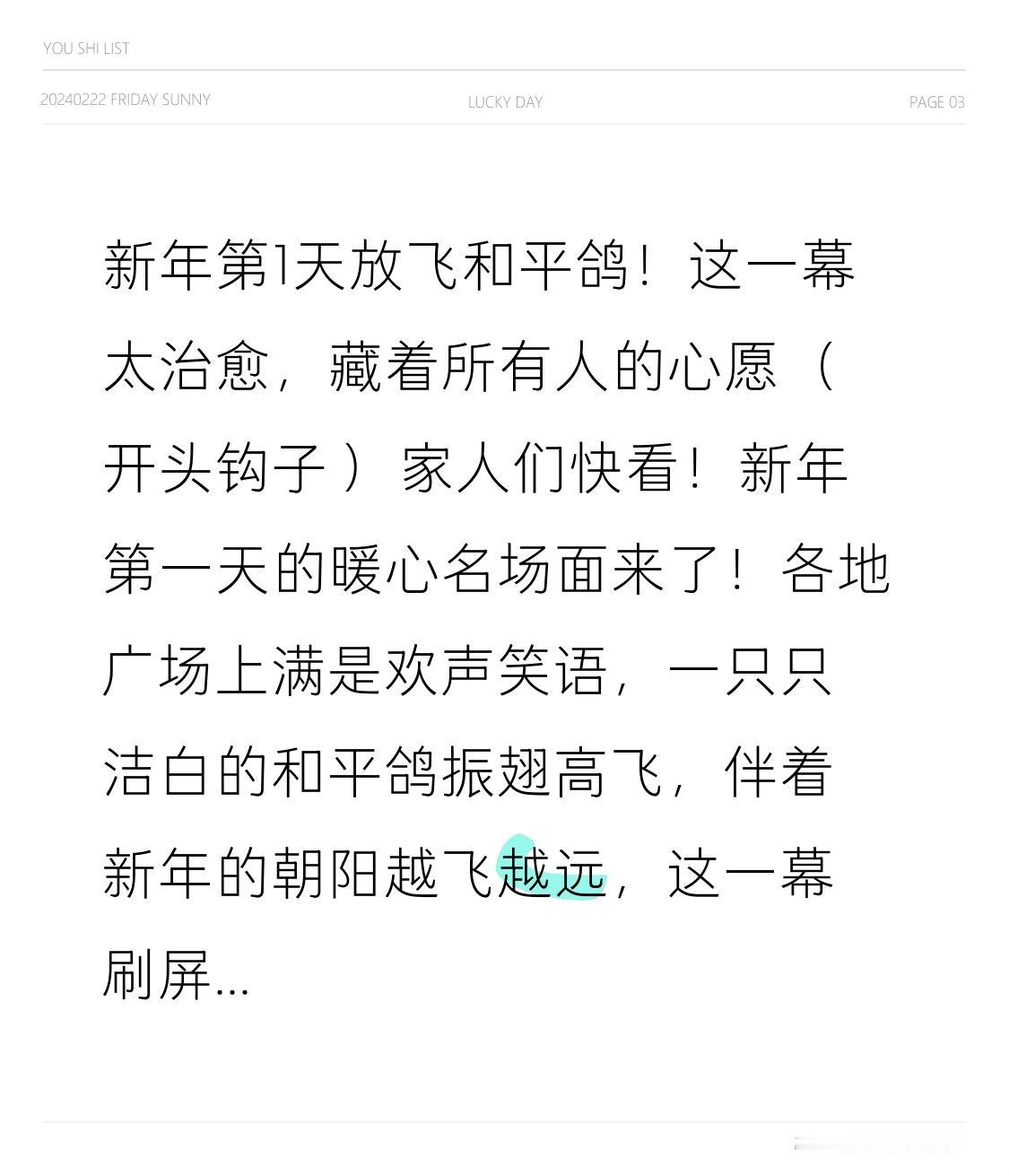 新年第1天放飞和平鸽!这一幕太治愈,藏着所有人的心愿 家人们快看!新年第一天的暖心名场面来了!各地广场上满是欢声笑语,一只只洁白的和平鸽振翅高飞,伴着新年的朝阳越飞越远,这一幕刷屏全网,治愈了无数人!新年开篇不只有烟火喧嚣,还有这般温柔又庄重的瞬间,放飞的是和平鸽,更是所有人藏了一整年的期盼,看完心里满是暖意,一定要看到最后! 有人说,新年放飞和平鸽不过是一场仪式,热闹过后就没了痕迹,可只有真正见证过这一幕的人才懂,这从来不是流于表面的形式,而是刻在每个人心底最朴素、最真挚的心愿,远比热闹的庆祝更有分量。小时候总觉得和平鸽只是课本里的符号,代表着遥远又抽象的和平,长大后才明白,和平从不是理所当然的馈赠,是安稳日子里的三餐无忧,是家人团聚时的欢声笑语,是出门在外的平安顺遂,是职场打拼的安稳踏实。 新年第一天,大人牵着孩子的手,小心翼翼将和平鸽托在掌心,轻声叮嘱着新年心愿;白发苍苍的老人望着展翅的白鸽,眼里满是温柔与欣慰;年轻人举起手机定格这一幕,把美好与期许一起珍藏。每一只腾空的和平鸽,都载着一份专属心愿:有人盼家人岁岁平安,无灾无难;有人盼日子蒸蒸日上,顺顺利利;有人盼山河无恙,人间皆安;还有人盼前路坦荡,万事可期。不同于新年祈福的功利与急切,放飞和平鸽的瞬间,多了几分从容与庄重,不用豪言壮语,不用华丽辞藻,这份温柔的期盼,早已胜过千言万语。 更让人动容的是,如今新年放飞和平鸽早已成了各地的暖心传统,从城市广场到校园操场,从社区小院到景区长廊,洁白的身影伴着新年的钟声起飞,不分年龄、不分地域,所有人都在这一刻驻足凝望,为新岁祈愿,为和平祝福。这一幕,不仅是新年最美的风景线,更是所有人内心最真实的写照:比起追名逐利,我们更渴望安稳;比起轰轰烈烈,我们更偏爱平安。 家人们,新年第一天放飞的和平鸽,飞过高山湖泊,飞过市井烟火,也飞进了每一个普通人的心底。它承载着我们对新岁的所有期许,更藏着大家对和平安稳最执着的向往。新的一年,愿白鸽所至,皆是坦途;愿山河无恙,人间皆安;愿我们每一个人,都能在安稳的岁月里,守着家人,伴着温暖,把小日子过得热气腾腾。愿往后岁岁年年,皆有和平相伴,皆有喜乐相随,新年伊始,万物可爱,人间值得,未来可期!