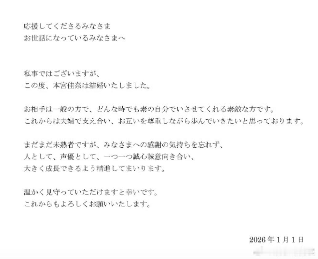 声优本宫佳奈结婚本宫佳奈结婚 声优本宫佳奈(33)于1月1日更新个人X账号,发布手写信官宣结婚喜讯。她在信中写道:“向大家报告一则私事,本宫佳奈已于近日结婚。” 同时介绍道,“我的另一半是圈外人士,他是一位无论何时都能包容我本真模样的优秀之人”,并表示 “往后我们夫妻二人会彼此扶持、相互尊重,携手共度人生”。
