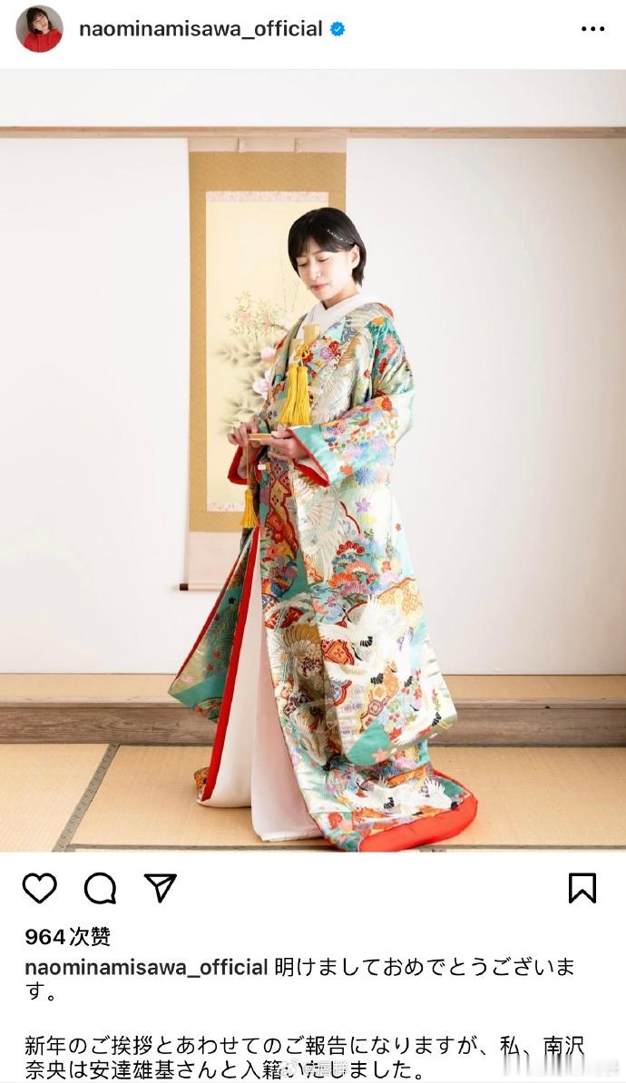 南泽奈央结婚南泽奈央安达雄基结婚 据日媒,女演员南泽奈央(35)于1月1日更新个人IG宣布与踢踏舞演员安达雄基结婚的喜讯,“今后我们二人会相互尊重、彼此扶持、共同进步,携手走过人生的旅途。也恳请大家今后继续支持我们。”