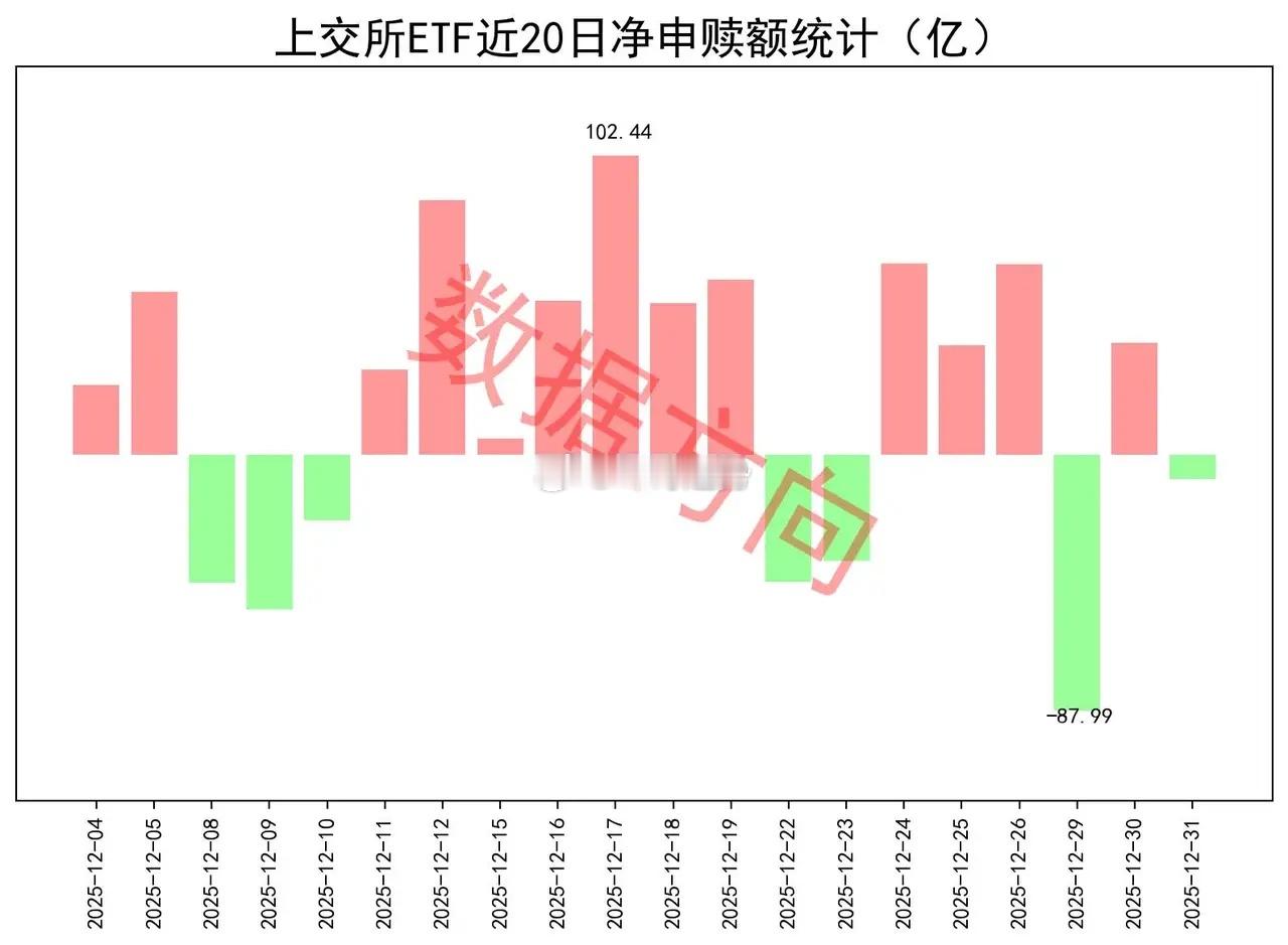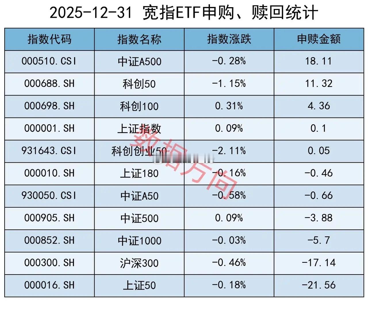 2025年最后一个交易日,ETF申赎如何?12月31日星期三,大盘窄幅整理,商业航天、AI应用等涨幅居前。上证指数涨幅0.09%,上交所ETF合计净赎回8.3亿元。宽指中证A500指数(18.11亿)、科创50指数(11.32亿),净申购超过10亿。科创100指数(4.36亿)、上证指数(0.1亿)、科创创业50指数(0.05亿),分别获小幅净申购。上证50指数(-21.56亿)、沪深300指数(-17.14亿),净赎回居前。中证1000指数(-5.7亿),净赎回超过5亿。中证500指数(-3.88亿)、中证A50指数(-0.66亿)、上证180指数(-0.46亿),分别被小幅净赎回。行业和主题 科创芯片指数(5.53亿)、半导体材料设备指数(1.32亿)、中证半导指数(1.21亿),一起进入申购榜。细分有色指数(3.22亿)、工业有色指数(3.2亿),一起进入申购榜;稀土产业指数(-1.17亿)、有色金属指数(-1.0亿),一起进入赎回榜。中证红利指数(2.47亿)、红利低波指数(2.2亿)、中证现金流指数(1.38亿),一起进入申购榜。其他进入申购榜的还有:机器人指数(2.22亿)、卫星产业指数(1.28亿)。中证军工指数(-4.95亿)、军工龙头指数(-2.06亿)、中证国防指数(-1.06亿),一起进入赎回榜。科创AI指数(-1.11亿)、科创创业AI指数(-0.93亿),一起进入赎回榜。其他进入赎回榜的还有:通信设备指数(-4.11亿)、证券公司指数(-1.92亿)、中证银行指数(-0.91亿)。ETF财经股市