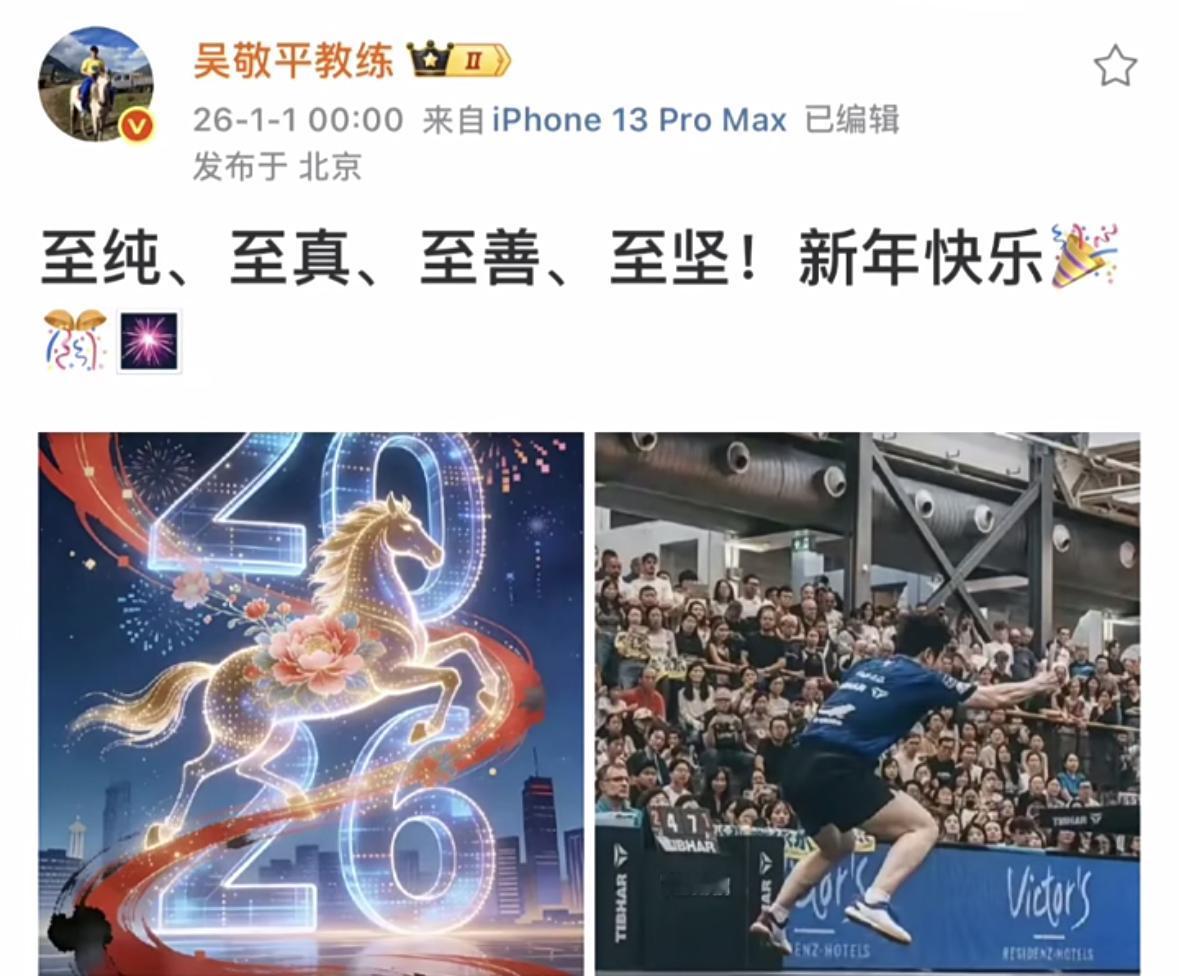 吴敬平教练新年卡点给樊振东高度评价及马年祝福: 致纯,致真,致善,致坚! 新年快乐🎆🎆🎉! 老人家一直关注樊振东, 又给出爱徒这样高的评价, 可见樊振东有多么阳光☀️, 真的给老爷子点赞👍, 樊振东的魅力无人能敌, 果然是世界第一可爱😍, 吴敬平教练对樊振东是纯爱, 打心眼里喜欢这个关门弟子, 当长孙一样疼爱, 2026新年之际, 祝愿这对师徒, 开心健康快乐, 幸福喜乐步步高升!