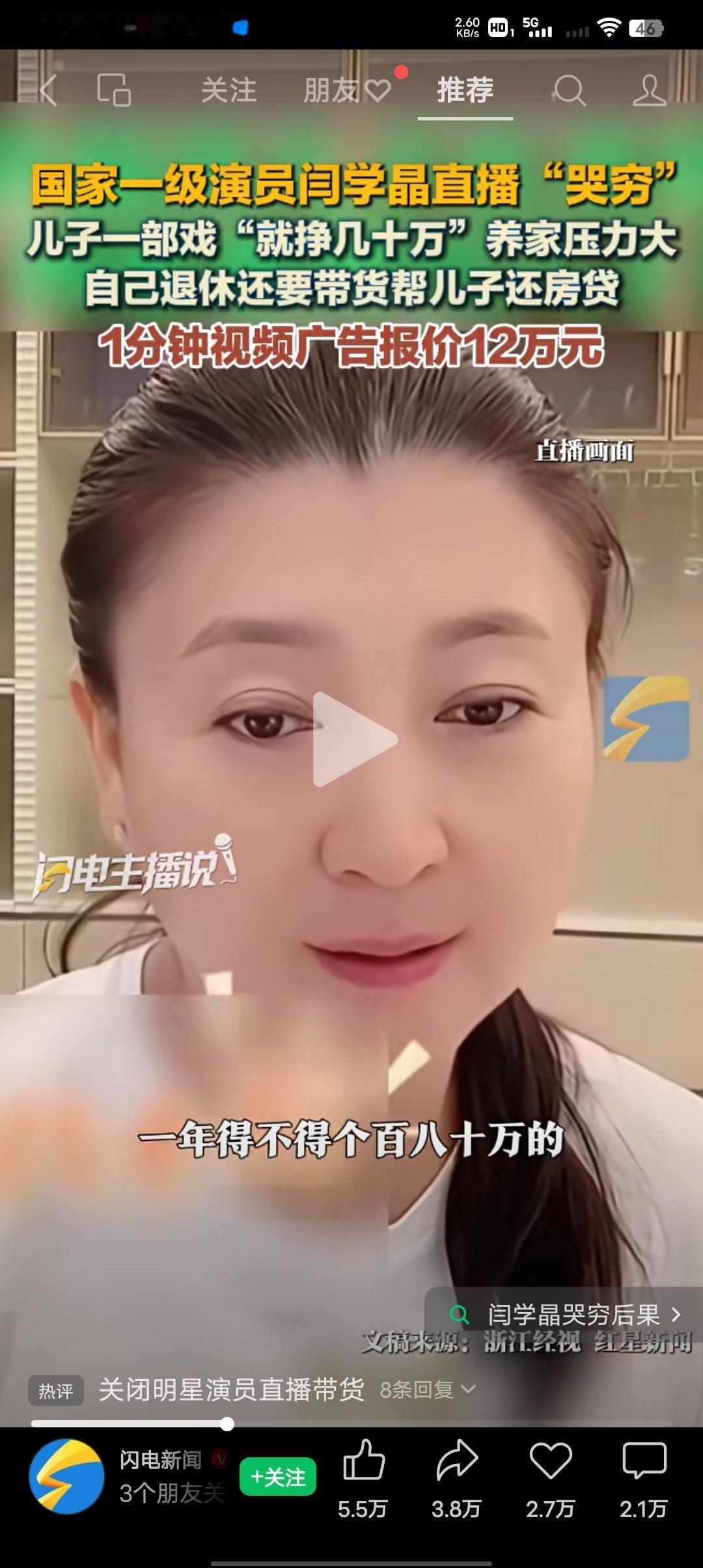看看明星跟普通人的差距有多大? 国家一级演员闫学晶直播“哭穷”, “儿子一部戏就挣几10万,这个家一年不得有百10万左右才能运转,他挣不来,他们一年的收入也就40万左右,养家压力很大,自己已经退休还要直播带货给儿子还房贷车贷” 大伙听听,百万左右怎么在她眼里说的就100元似的呢,我们普通人真的共情不了。这就是有钱人跟普通人的区别吧!人家一年40万左右还算少,我们普通人一年10万存款的话都是奢望,你说这要怎么比?还怎么让人共情? 闫学晶开始的时候说演员要接地气,结果这是要接到天花板了,人家一年40万都嫌少,那我们普通人一年存个3万还觉得就是存钱了呢,没法比直接没法比,还是洗洗睡吧!