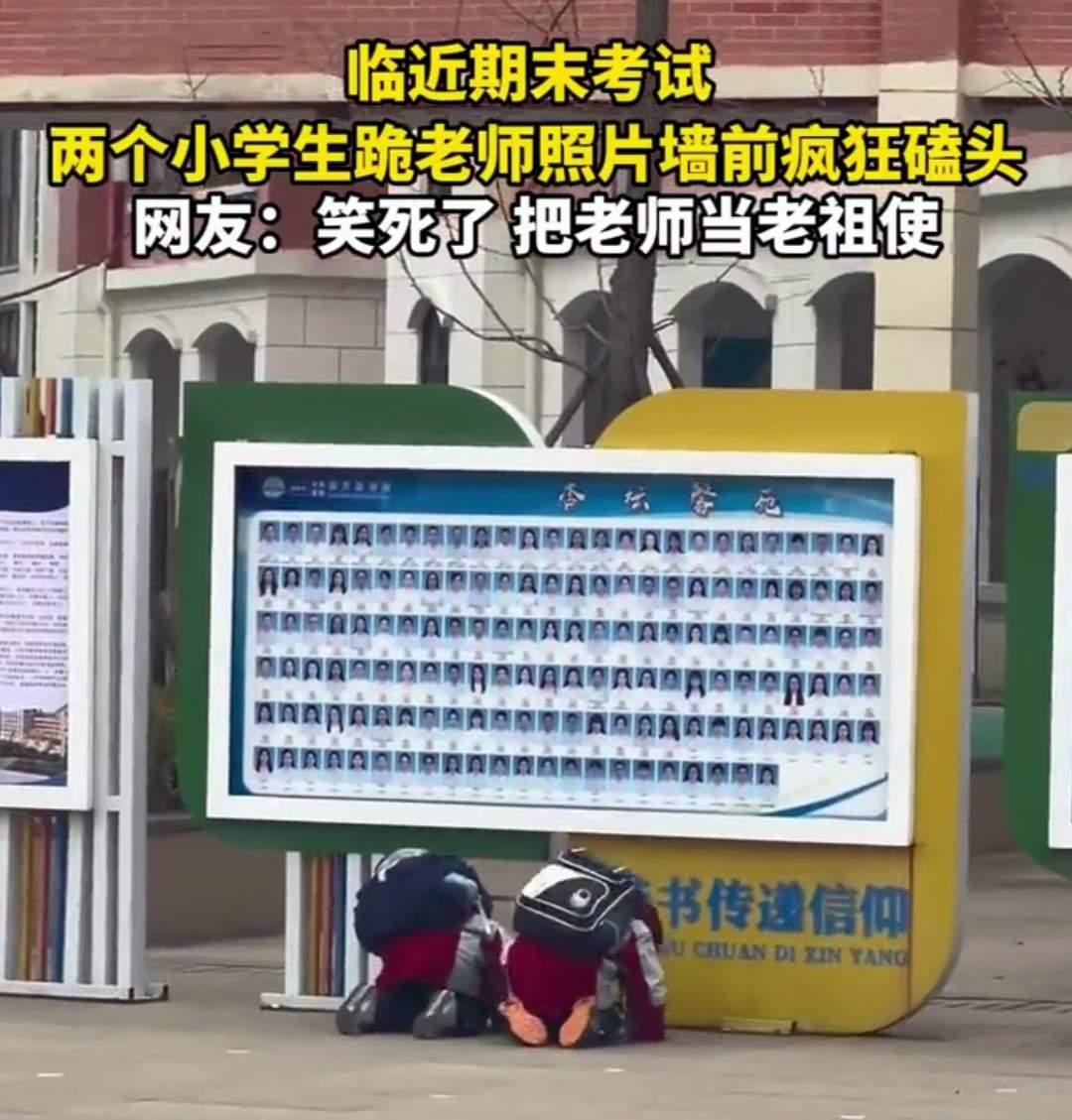 笑不活了!贵州,临近考试,2个小学生溜到学校走廊的老师照片墙前,“扑通”一声跪下磕头,盼着能靠这招拿高分,这事被拍下来后,一下子就在网上火了,网友:这是把老师当老祖使呢! 贵州一所小学里,一位老师正准备去上课,刚走到教学楼走廊,就看见老师照片墙前蹲着两个小身影 他还以为孩子们是在找掉在地上的东西,站在旁边看了半天,才反应过来这俩孩子是规规矩矩跪在地上磕头,原来是盼着期末考试能考个好成绩。 老师当下就觉得这个场面很神奇可爱,把这一幕拍了下来发到网上。 照片里的两个孩子,小身板跪得笔直,一脸认真虔诚的模样,一看就是把“心诚则灵”这四个字刻进了心里。 有网友说:这操作简直笑喷,是把老师当老祖来敬了吧! 也有网友调侃:现在的孩子为了分数,真是啥招都想得出来,在做题和作弊之间,果断选了“作法”! 还有网友暖心表示:小小年纪太可爱了,这份单纯的执念,看着又好笑又心疼。 老师看到孩子们的举动后,也没有批评指责,只是笑着走过去告诉他们,好成绩不是靠磕头求来的,得靠平时上课认真听讲、作业认真完成,一步一个脚印积累才行。 其实说到底,孩子们的做法没有半分恶意,不过是面对考试时,用一种天真的方式给自己求个心安,这份可爱的“小聪明”,藏着的是他们对好成绩的期待。 说真的,看着孩子们磕头的样子,先是觉得好笑,笑着笑着就有点不是滋味。 这哪是什么“心诚则灵”,分明是孩子在面对考试前的手足无措,有可能这份焦虑来自于部分家长和老师,在无形中把焦虑悄悄传给了孩子。 其实对于考试,拼的从来不是磕头的虔诚,而是我们大家平日里实实在在的努力,日积月累拼搏出的知识点,加油吧,向着梦想出发! [福]祝同学们逢考必过,心想事成,万事如意[福]
