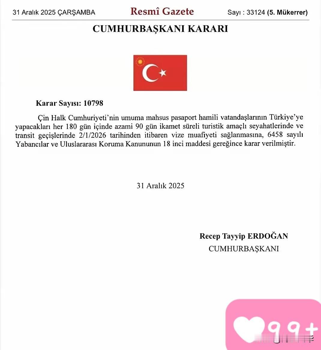 2025年最后一天晚上的深夜,土耳其icon可谓是突然对中国发大招,埃尔多安icon正式签署总统令,决定自2026年1月2日起,为中国持普通护照的公民前往土耳其实行免签,每180天内最多停留90天。 这消息一出来,旅游圈直接炸了锅!以前去土耳其,光电子签就得花77美元,还得提前1-3天填资料等审核,不少人因为材料不全耽误行程。现在好了,护照揣兜里,机票一订就能出发,省下的签证费刚好够吃两顿正宗土耳其烤肉。 土耳其可不是心血来潮送温暖,背后全是实打实的经济考量。旅游业占它GDP超10%,2024年接待中国游客40.97万人次,同比暴涨65.1%,中国已经成了它增长最快的客源地。人家的目标很明确,就是要靠免签把中国游客量冲到每年100万。 看看隔壁塞尔维亚就知道免签的威力。自从对中国免签后,2024年中国游客超15.6万人次,比上年增长70%,餐厅、酒店全被订爆。土耳其这步棋,就是想复制这种成功,毕竟中国游客人均消费近1000美元,停留时间还长,是实打实的优质客源。 但大家别光顾着高兴,有些规矩还得记牢。免签只针对旅游和过境,想工作、上学还得办专门签证。入境时可能要查返程机票、酒店订单,护照有效期得超6个月,空白页也得留够,不然可能被拒入境。 还有个事儿得说清楚,这是土耳其单方面免签,咱们还没对等开放。不是咱们小气,而是作为人口大国,全面免签得考虑管理压力。但只要双边交流越来越深,未来互免签证也不是没可能。 土耳其这波操作,很可能带动连锁反应。现在中亚、中东欧不少国家都在抢中国游客,接下来格鲁吉亚、哈萨克斯坦说不定也会跟着放开。中国护照的含金量,早就随着国家实力水涨船高,现在已经有90多个国家和地区对咱们免签或落地签。 不过也得提个醒,土耳其近年通胀厉害,景点门票、酒店价格不低,圣索菲亚大教堂门票就25欧元,卡帕多奇亚热气球更是按欧元收费,出发前得把预算算明白。安全方面,大城市没问题,偏远地区最好提前查下领事提醒。 这张免签令,本质上是国家实力的双向奔赴。中国游客有消费力,土耳其有旅游资源,互相成就罢了。从十年前办签如闯关,到现在说走就走,变化的不只是签证政策,更是咱们走向世界的底气。 各位读者你们怎么看?欢迎在评论区讨论。
