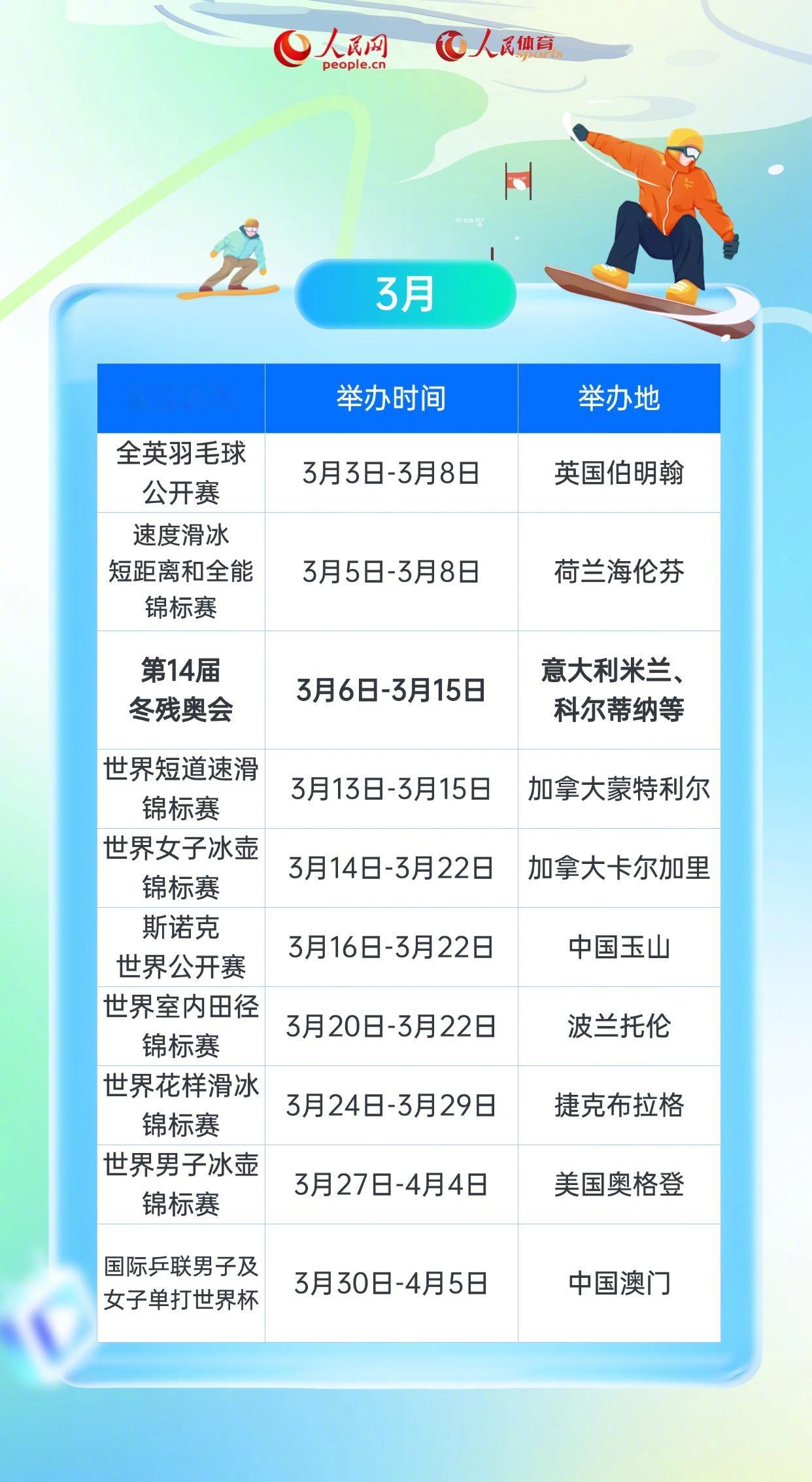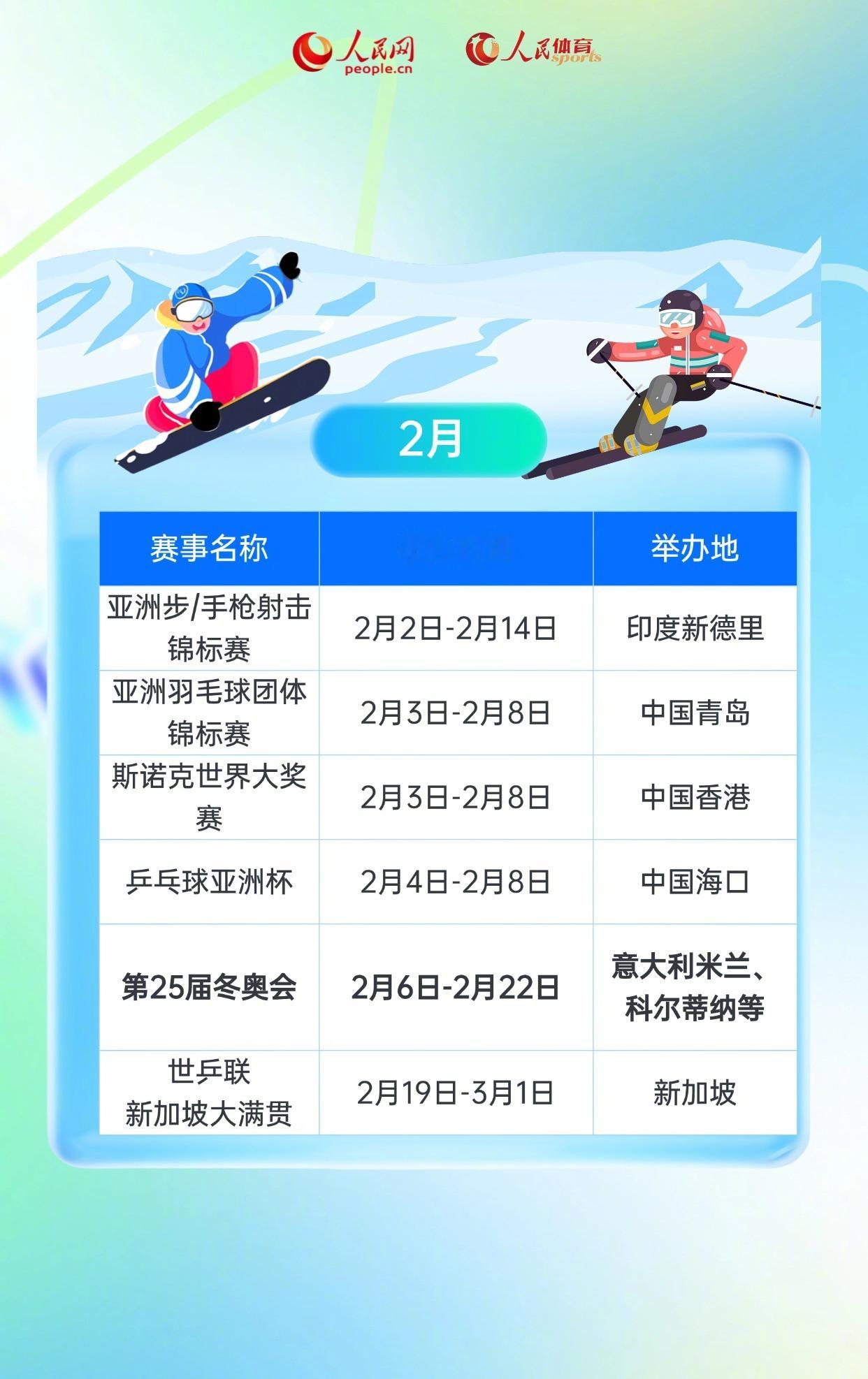 2026年度体坛赛事早知道一键收藏2026年重点体育赛事赛历。2026年又是一个大赛扎堆的“体育大年”,冬奥会、世界杯、亚运会三项大赛接连上演,乒乓球世锦赛、羽毛球汤尤杯接踵而来,快快收藏2026年重点体育赛事赛历,心仪比赛不错过。2026一起打call(人民网)