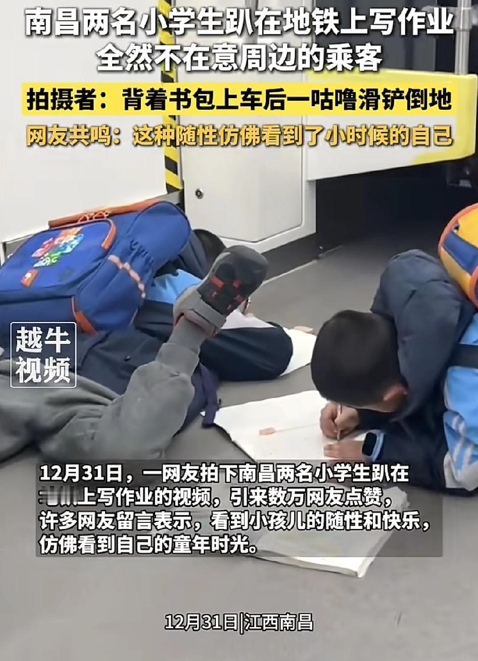 江西南昌有网友乘坐地铁时看到两名小学生放学之后惬意的趴在车厢的地板上写作业,毫不在意周边的人群。有网友说,看到孩子这么自由自在,感受到他们的快乐。也有网友表示会有一点点的心酸,毕竟一下课乘坐交通工具的同时还要写业。不过乘坐地铁需要一定的时间,利用好这段时间把这些作业写完了,回家好好休息一下,也是不错的。