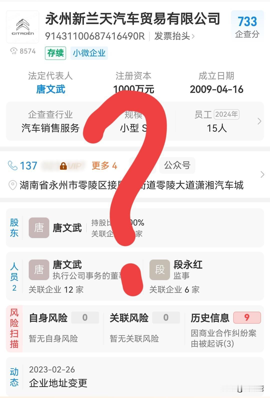 湖南永州队奇迹般夺冠后,她却神秘的消失了。不仅失联了,而且清空了社交媒体上的所有信息。 出现这尴尬的原因竟是唐董事长曾豪言壮语对着永州队所有球员承诺如果拿到冠军就每人送一辆车。现在突然失联,永州队教练和球员却还在帮这位唐董事长说话。大家并没有怪她,还说她曾经在球队最困难的时候还捐助过10万元现金。大家都在帮她开脱她说的那番话是在祝福球队,激励大家。 事到如今,不知是不是这个送车承诺无法兑现,唐董事长玩起了失踪。现在,不仅全永州的人都在惦记她,全国的球迷也都在期待她来个大反转! (博主推断:在公司搜索中,只有图片2有点像唐董事长公司。会不会就是唐蕾公司?“唐蕾董事长”会不会是自自封的?她跟图片中的法人都姓唐,会不会是亲属关系?如果是,可以肯定的是唐蕾没有股份,看起来公司规模不大,如果要兑现还真是有资金压力)