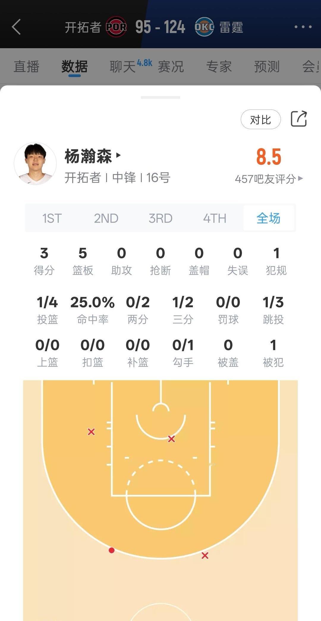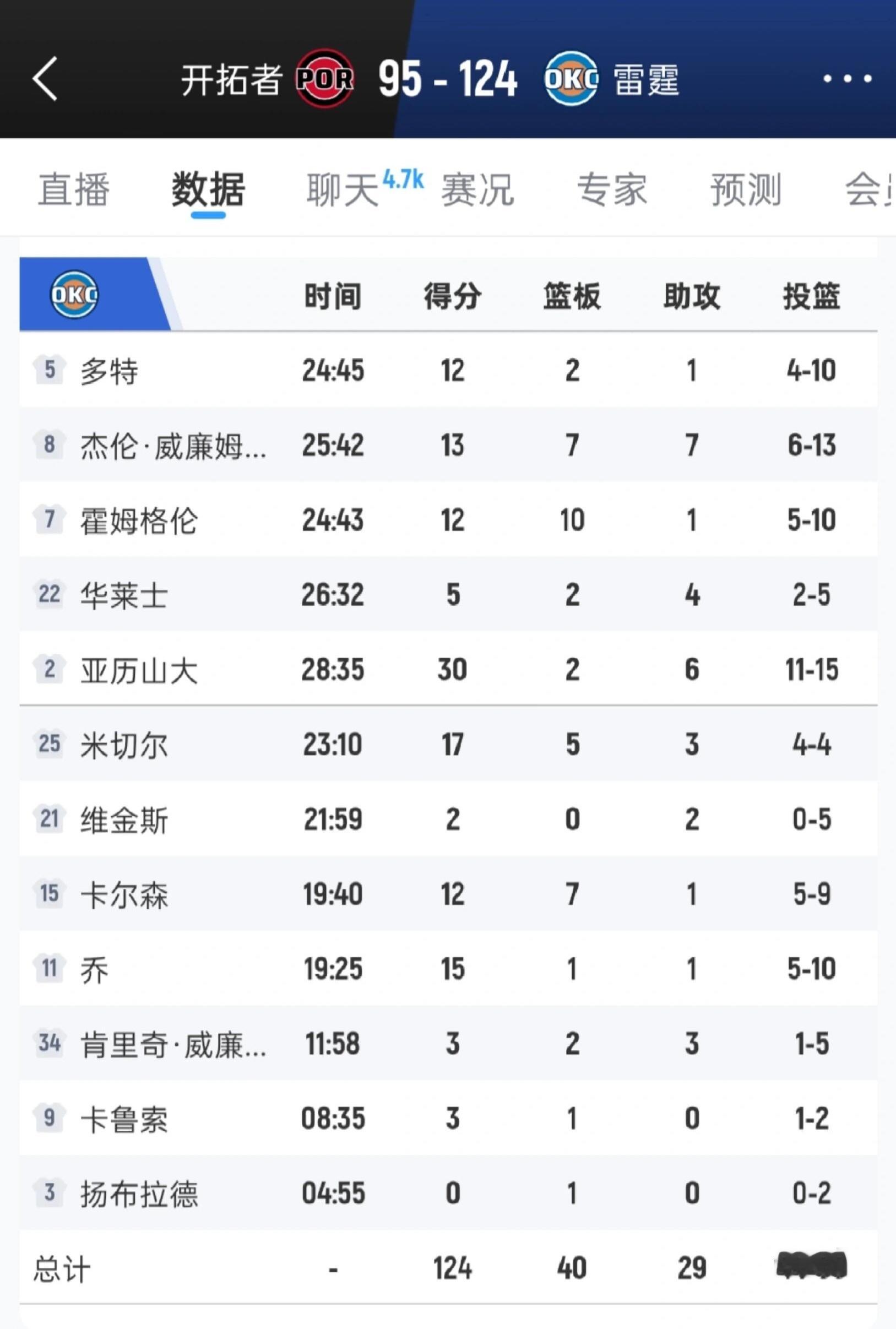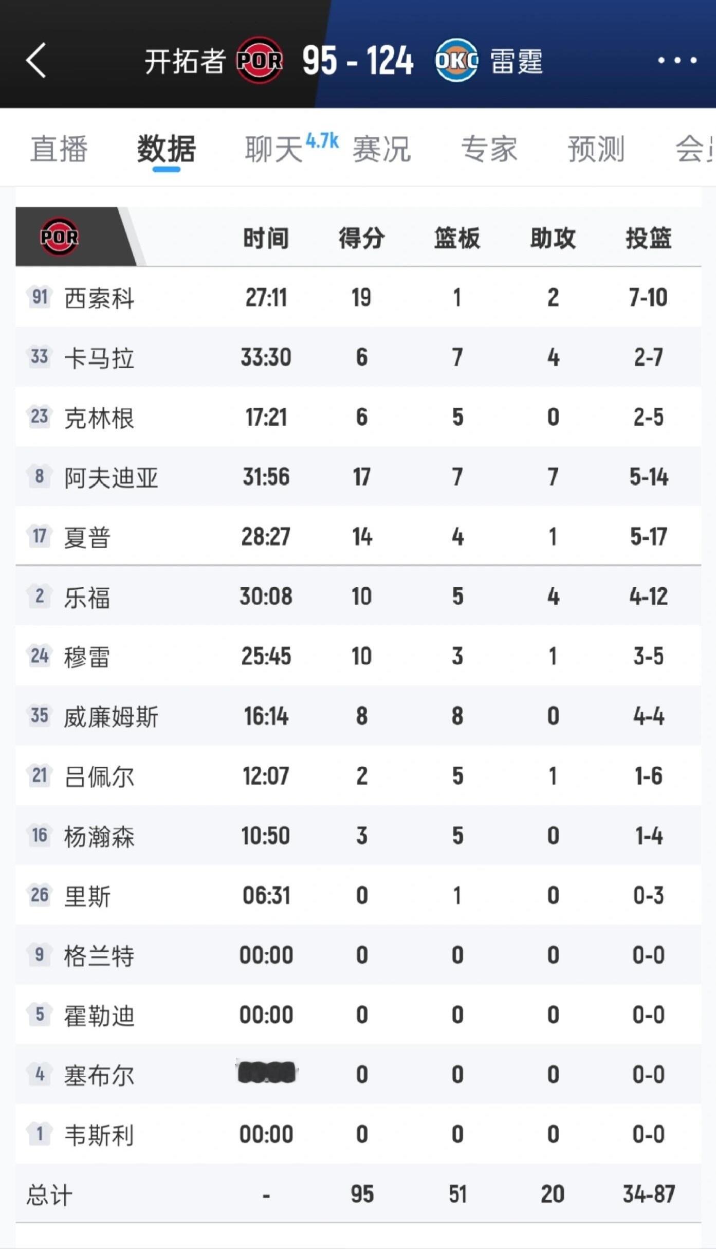 雷霆大胜开拓者,杨瀚森拿到3分5篮板。开拓者vs雷霆