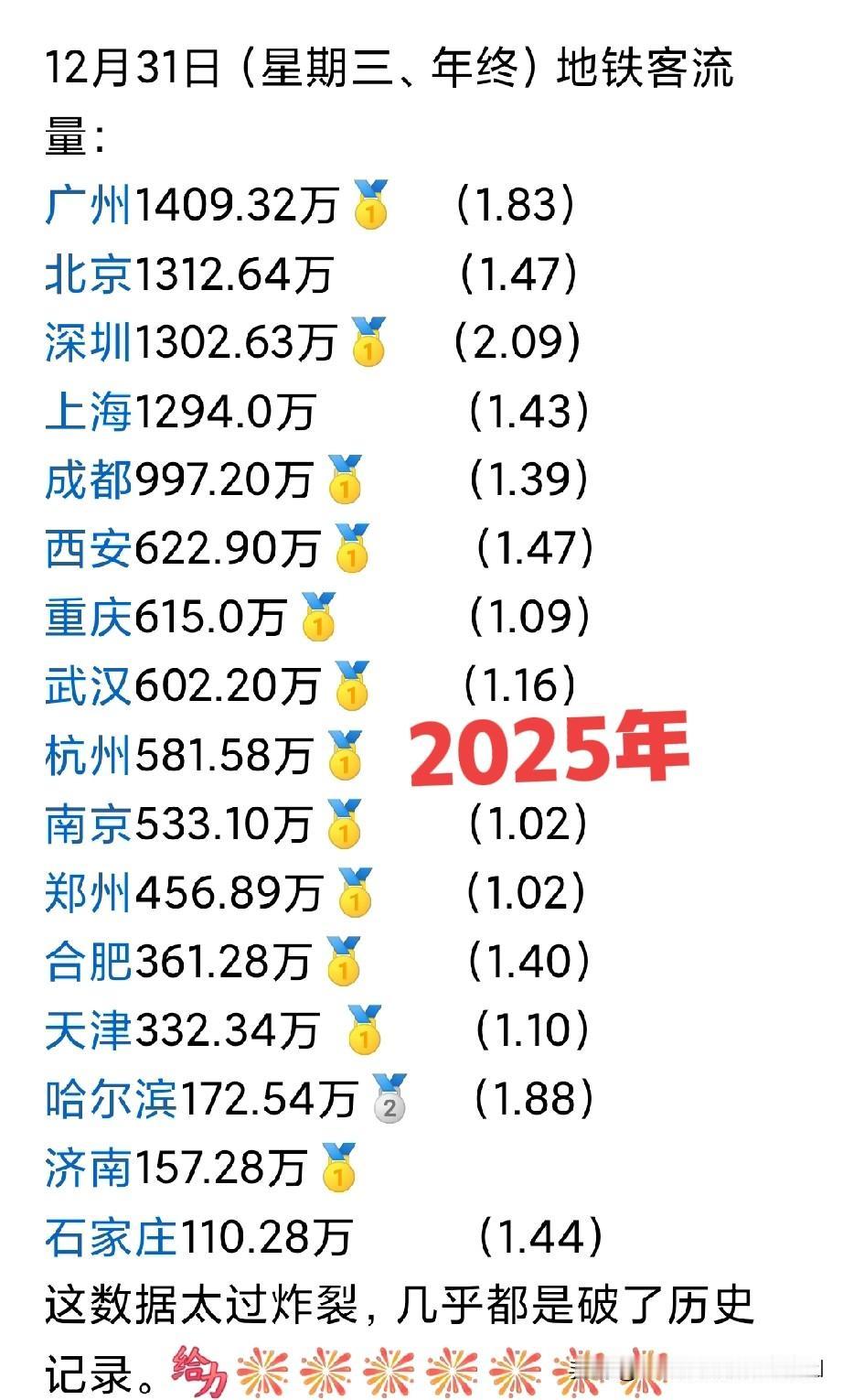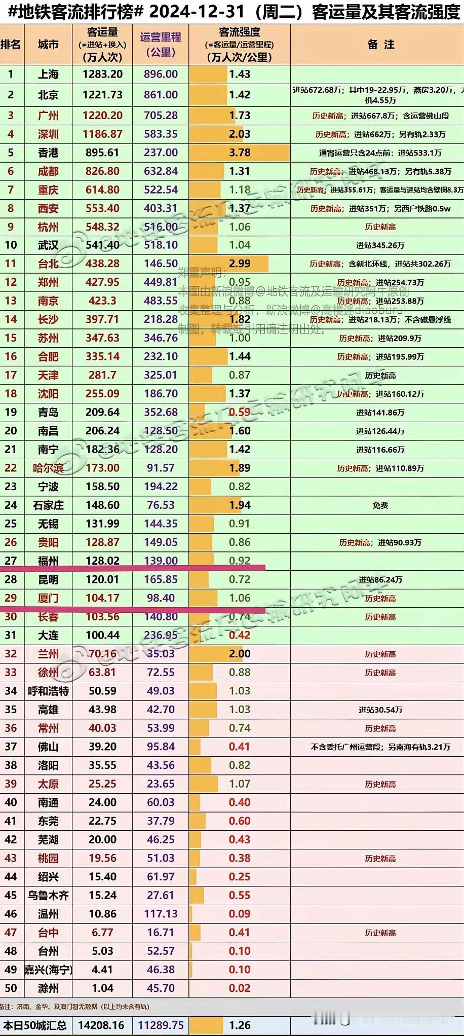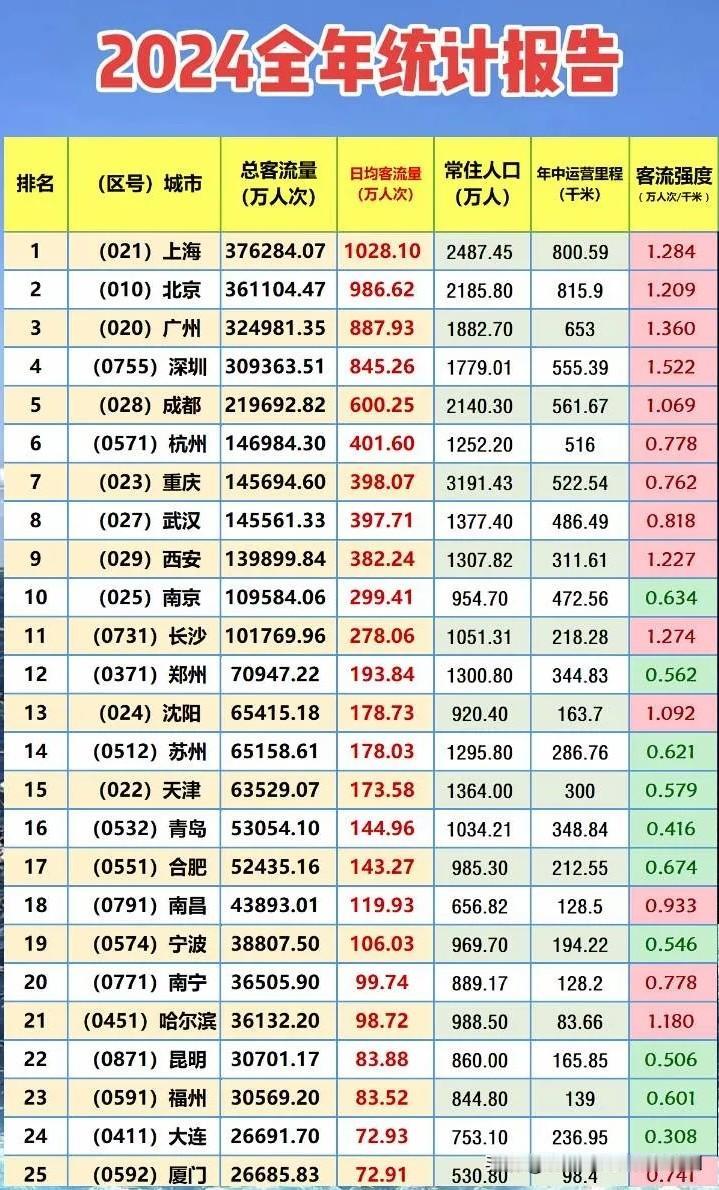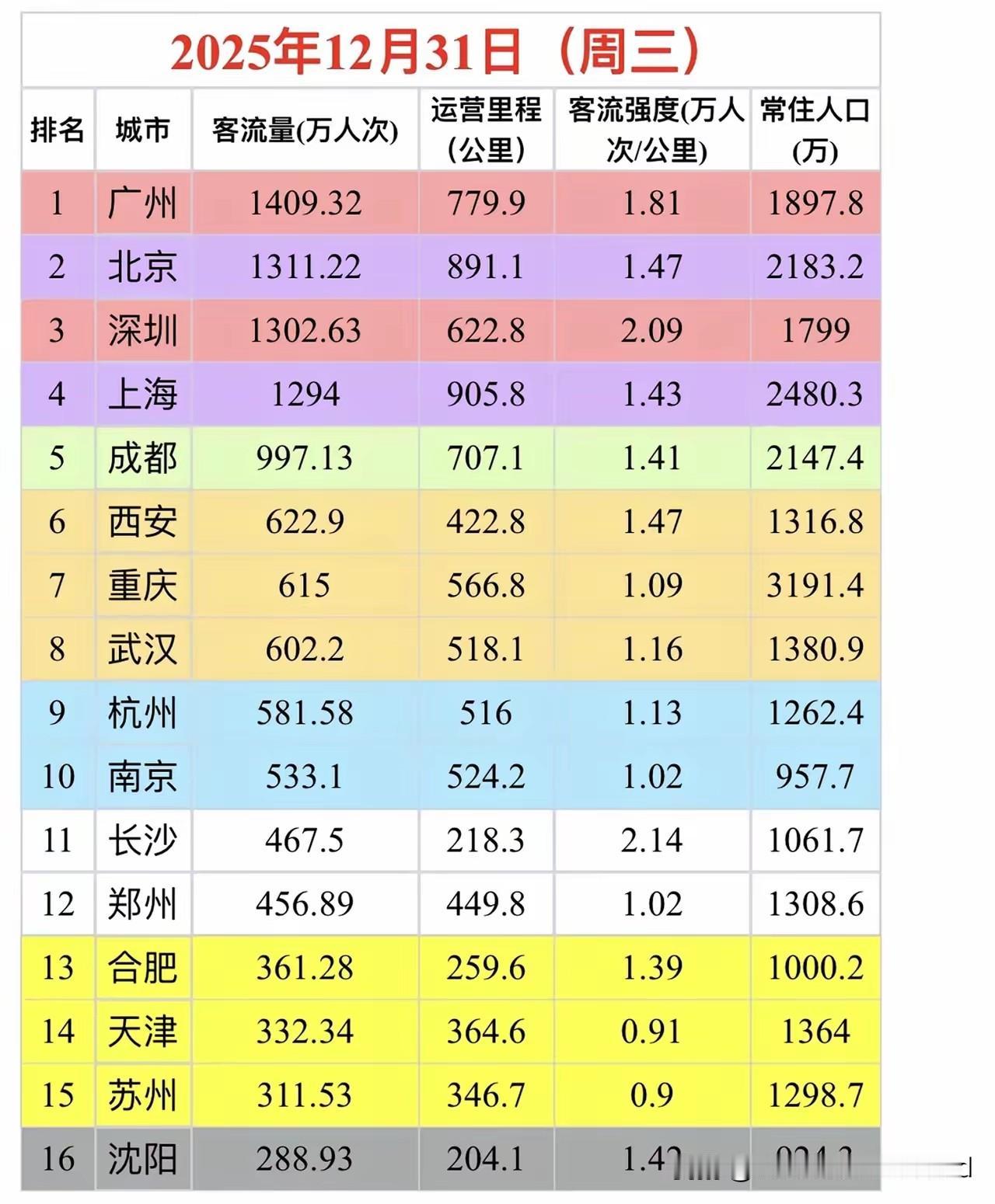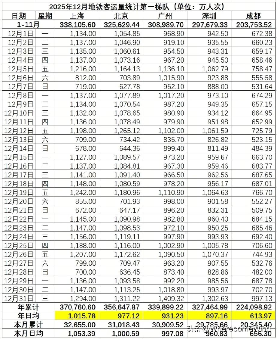 2025年全国地铁客流收宫, 上海,北京,广州,深圳,成都 稳坐前五。 与202