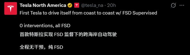 刚刚,特斯拉FSD,完成全球首个完全自动驾驶的横穿美国。