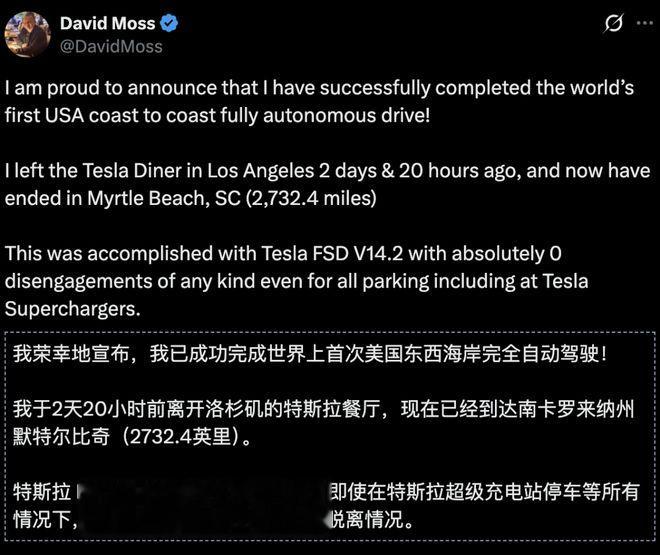 这次横穿美国大陆,不仅体现了FSDV14.2的技术能力,也向整个行业证实——