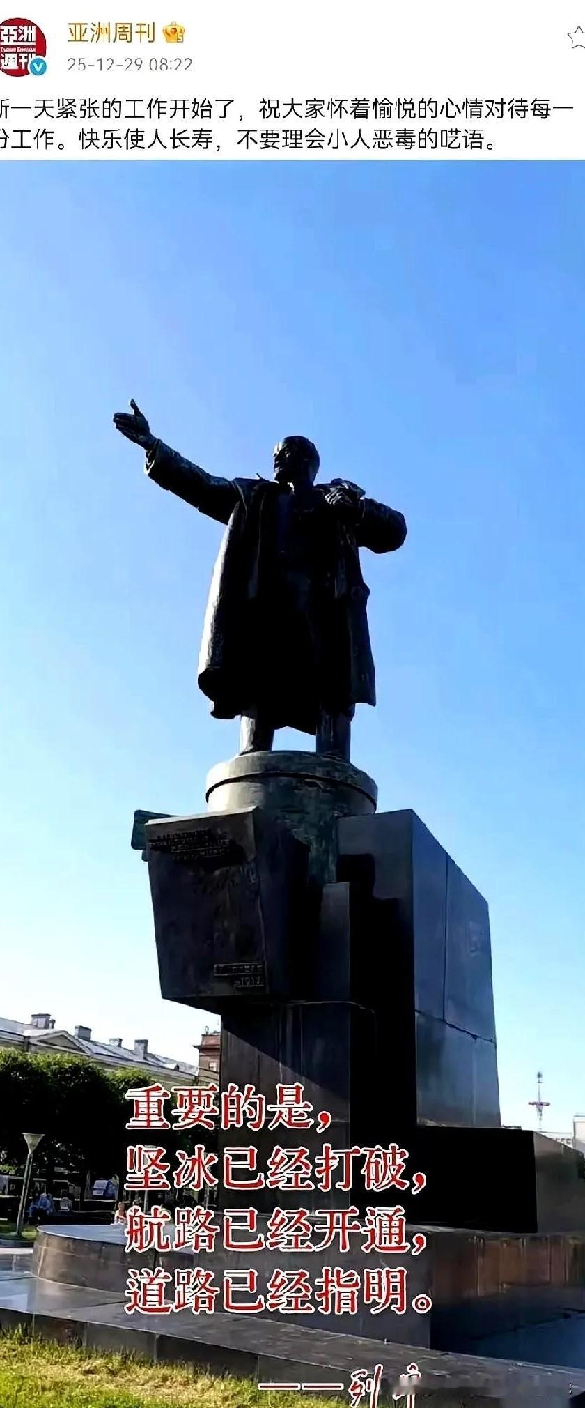 真正的高级反击, 从来都不是撒泼骂街, 而是体面里藏着千钧之力! 《亚洲周刊》被捂嘴删稿,没辩解没哭闹,反手甩了张列宁雕像配文。一句“快乐使人长寿,不要理会小人的呓语”,既显格局又戳要害,压根不跟纠缠者在一个维度拉扯。 更绝的是“坚冰已经打破,航路已经开通”,这话藏着大智慧:该曝的料已出,该引的关注已来,调查组也已进驻,剩下的自有公论。 这哪是认怂,分明是文化人的风骨——不与烂事纠缠,却把态度刻进人心。真正的力量从不是嗓门大,而是沉得住气、守得住体面,用最文雅的方式,让公道自有回响。 你见过最体面的“反击”是什么样?来评论区聊聊~