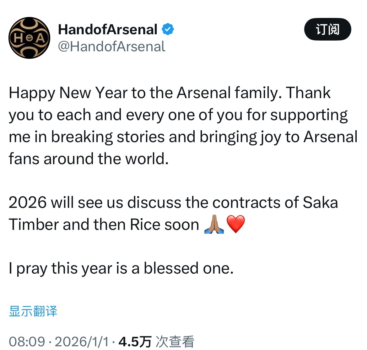 HandofArsenal:2026年,阿森纳将很快就廷伯和赖斯的续约合同开展商谈,希望是一个充满祝福和幸福的年份。