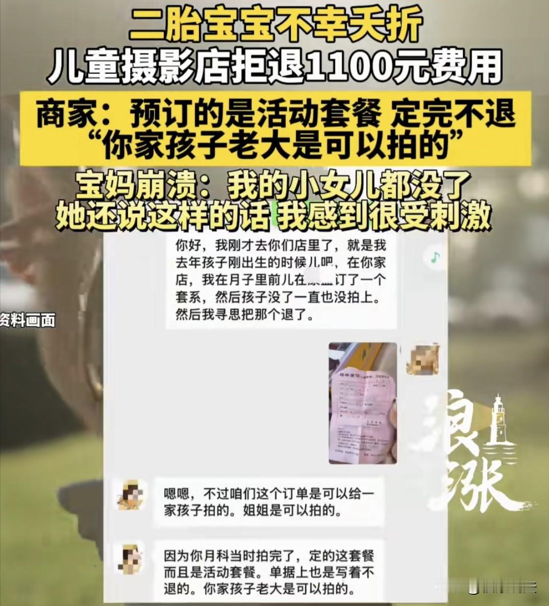 “该不该退?”吉林市,女子在摄影店给二胎女儿定了一套宝宝照,花了1100元,数月后,女儿得了小脑肿瘤去世,女子收拾孩子遗物时,发现摄影店的收据,才想起照片一张没拍,便找店家退款,不料,店家不但不退,还说可以让女子的大女儿来拍照,女子崩溃:我小女儿都没了,她说这话,我感到很受刺激!之后,女子发帖到网上,经协商,店家说给退500块钱,让女子先删除网上贴文,可女子这样做了。 2024年6月1日,耿女士生下了可爱的二胎女儿后,在一家月子中心坐月子,想着一边调养自己的身体,一边能好好的照顾宝宝。 这期间,一家儿童摄影店上门来,说可以免费给宝宝拍摄月子照。 看着照片里可爱的宝宝,耿女士满心欢喜,觉得给孩子留下珍贵的回忆也是值得的。 于是,在店家的热情的推销下,她额外购买了一套百天加周岁的照片套册,花了1100块钱。满心期待的希望能记录下宝宝成长的珍贵瞬间。 话说时间过得也快,耿女士的小女儿满了百天,她想着正好可以给女儿拍“百天照”了,便给摄影店打电话约时间。 店家却说,孩子还小,才满一百天,抬头不好看,让她晚一段时间再约。 耿女士听了店家的说法,也没多想,加上孩子小也没想折腾,这事就暂时放下了。 过了2个月后,耿女士想起给小女儿拍照的事,又给摄影店打电话,想预约拍照时间,不料,店家又变了卦。 店里告诉耿女士,说店里正在装修呢,现在拍不了,还得等一段时间。 就这样,耿女士只好把给小女儿拍照的事情搁置了,可她怎么也没想到,小女儿最终一张照片也没拍上! 2024年12月,耿女士的小女儿被查出了小脑肿瘤,这个消息如同晴天霹雳,让一家人陷入了无尽的痛苦和绝望之中。 之后,耿女士带着小女儿到北京的大医院治疗,不幸的是,小女儿的病太严重了,还是没有救过来,在2025年4月25日这天永远的离开了她。 耿女士悲痛欲绝,小女儿才10个月25天啊,她还那么小…… 此后,耿女士一直沉浸在失去小女儿的悲痛中,也忘了孩子宝宝照的事。 2025年12月份,耿女士在收拾小女儿的遗物时,看到了摄影店开的收据,她才想起来这件事,一想到孩子她就心痛不已,照片没拍上,她想着联系店家退回这1100块钱。 可是,店家的回应却让他再次遭受打击,店家不但拒不退款,还表示可以让耿女士的大女儿去拍照。 甚至,店家还说耿女士订的套餐是活动套餐,单据上写了“定完不退”。 耿女士直接崩溃了,“我小女儿没了,她说这种话,让我感到很受刺激!” 为了能让摄影店退回1100元摄影套餐费,耿女士只好选择去有关部门投诉。 耿女士说,后来有关部门工作人员给她打电话说,已经联系到摄影店的老板,老板只愿意退还500块钱,但是,耿女士要先把网上的贴文删除。 耿女士说她不能接受。 原来,耿女士要求对方退款被拒绝后,她就把这事发到网上了。 12月31号,记者联系了这家摄影店,该店的工作人员说,门店正常营业,关于此事老板和耿女士还在协商。对于具体情况,对方说不方便透露。 而后,记者又打了12315,工作人员表示,经查询,12月30日已经收到了与该摄影店有关的案件。目前正在受理中,一般办案时间需要3到5个工作日。 这件事让人唏嘘,耿女士的心情可以理解,但店家的做法从情感上确实值得商榷。 有人说,摄影店挣钱无可厚非,但人家没有去照相,不存在成本问题,主要人家这属于极特殊情况,应该退款。 这种特殊情况,我个人觉得应该给退款。失去孩子已经够难过的了,哪还有心情再去带大女儿去拍原本以为二女儿预订的摄影套餐,凡事不都应该有个例外嘛。 也有人说,估计应该是预订的相框或者相册之类的人家已经备货了,这些可能就没法跟上家退货的吧? 还有人说,这种特殊情况,金额也不是特别大,对商家也不会造成严重损失,咋就不退了呢?人家痛失爱子,还有心情带老大照相? 从法律上讲,耿女士小女儿离世属于在订立摄影套餐合同时无法预见的重大变化,继续履行合同对她明显不公平,她有权要求与摄影店重新协商,协商不成可以请求解除合同。 《民法典》第566条规定:合同解除后,尚未履行的,终止履行;已经履行的,根据履行情况和合同性质,当事人可以请求恢复原状或者采取其他补救措施,并有权请求赔偿损失。 合同解除后,对于尚未履行的拍摄服务,摄影店应终止履行。 由于耿女士已经支付了1100元套餐费用,而摄影店并未提供相应服务,按照公平原则,摄影店应将1100元全额退还耿女士。 摄影店老板只愿意退还500元且要求删除网上贴文的要求缺乏合理依据,耿女士有权拒绝并继续通过合法途径维护自己的权益。 另外,摄影店所谓的“定完不退”属于格式条款。 在耿女士购买摄影套餐时,如果摄影店没有提醒耿女士注意这个条款,也没有对她明确说明,那么耿女士可以主张这个条款不成为合同内容,也就是这个“定完不退”对耿女士没有约束力。