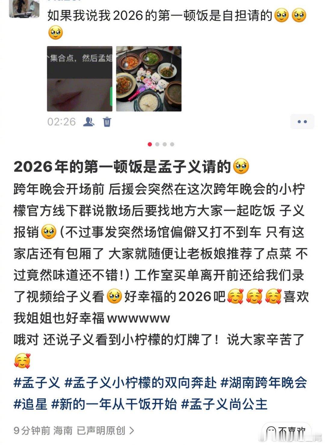 2026年第一顿饭是孟子义请的孟子义跨年夜请粉丝吃饭 是谁的偶像这么暖心?孟子义跨年夜请粉丝吃饭,2026年的第一份感动是孟姐给的!期待姐姐新的一年带来更多惊喜,永远做你最坚实的后盾!