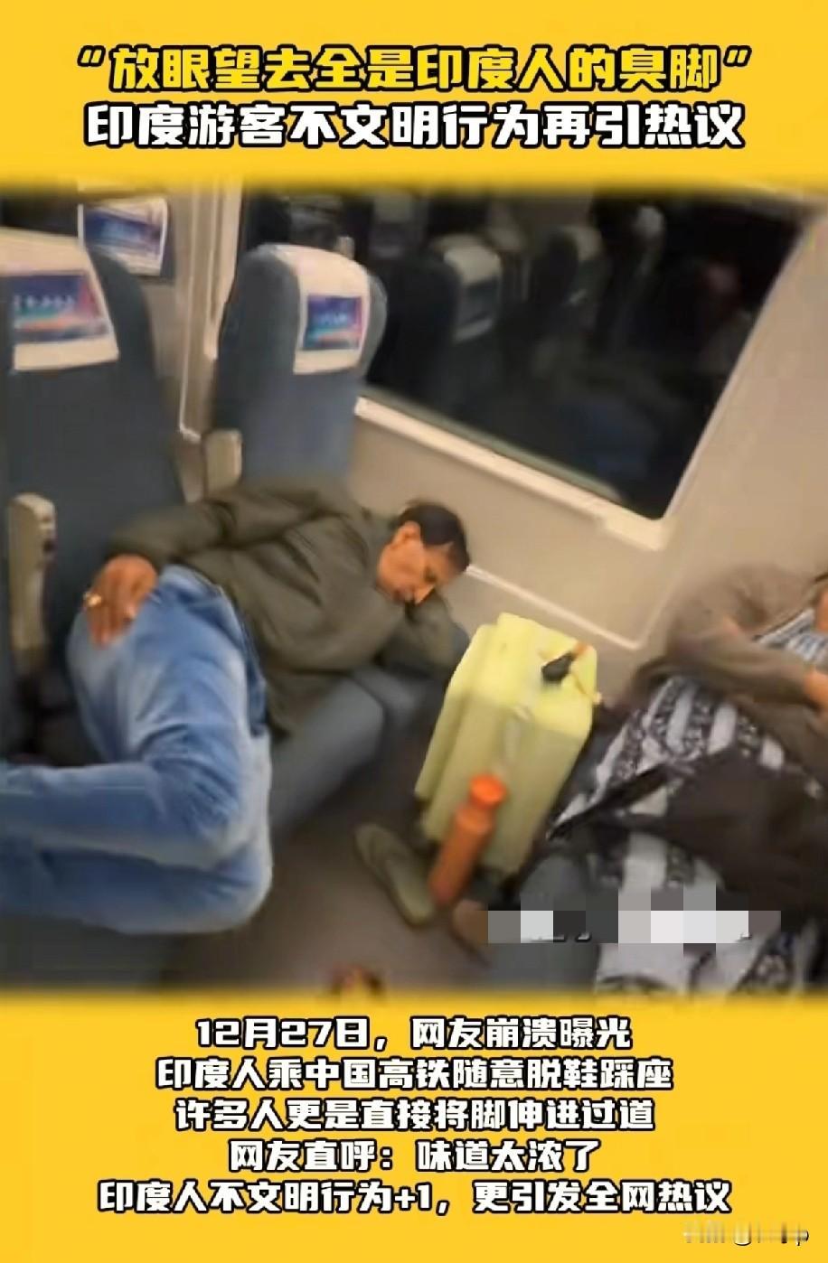 元旦的前几天一群印度人在高铁上脱鞋 并占座的视频让人看到非常不爽 一个车厢都是印度人的脚臭味 熏的不少乘客只能捂住鼻子 这群印度人显然把这当做了自家客厅 不少乘客直翻白眼的厌恶 后来乘务人员多次劝阻,没想到这群印度人根本不予理会,也是非常无奈 此前在上海的地铁里也有过报道 好几个印度人在车厢吃手抓饭 这些印度人仗着是外籍人士,就这么肆无忌惮的不遵守公共规则,难道真没有什么办法治他们吗,有大胆的人给出的建议是踢走他们的鞋,还有就是在他们旁边大声放印度神曲“燃烧的爱火”,这真个不错的建议。