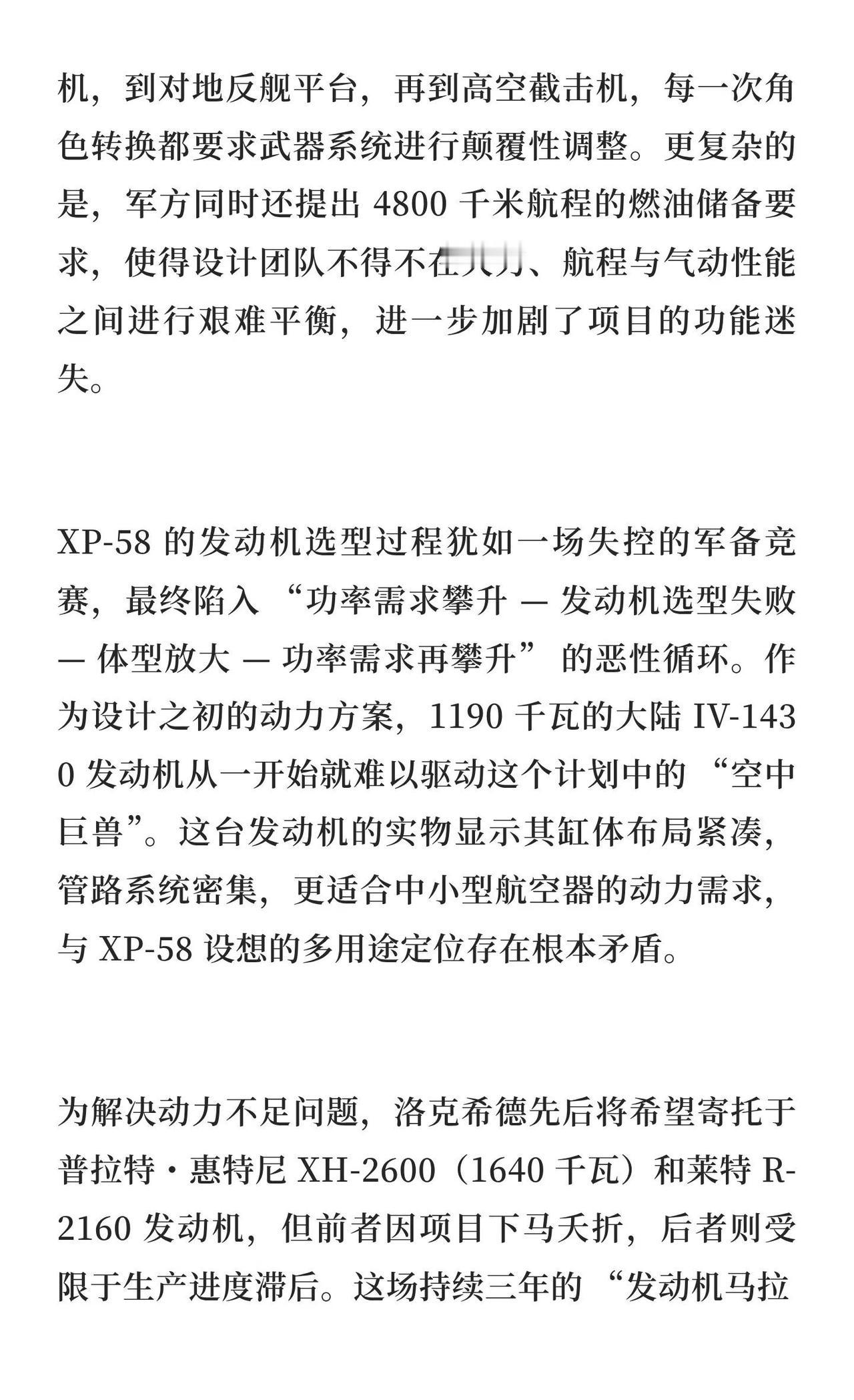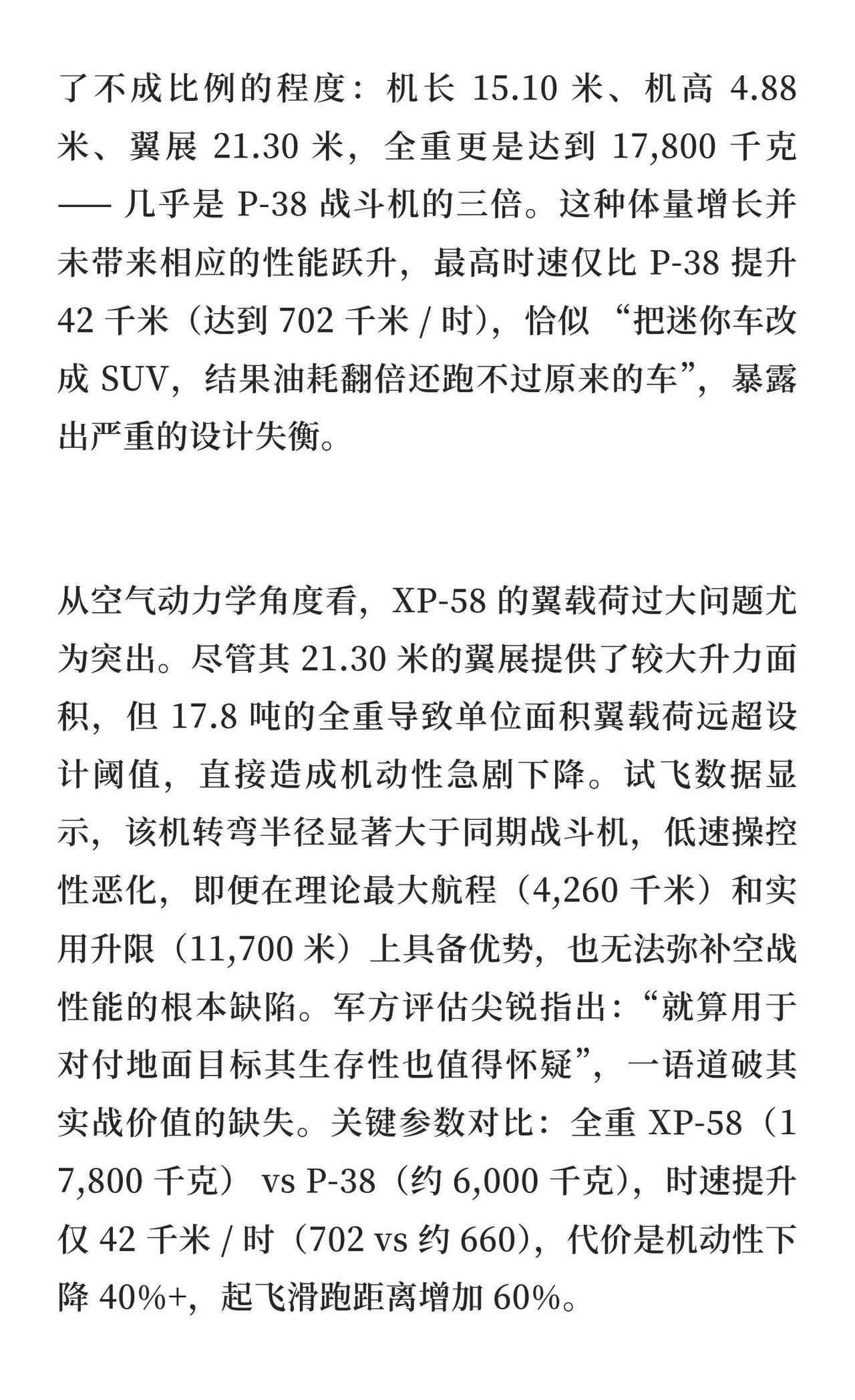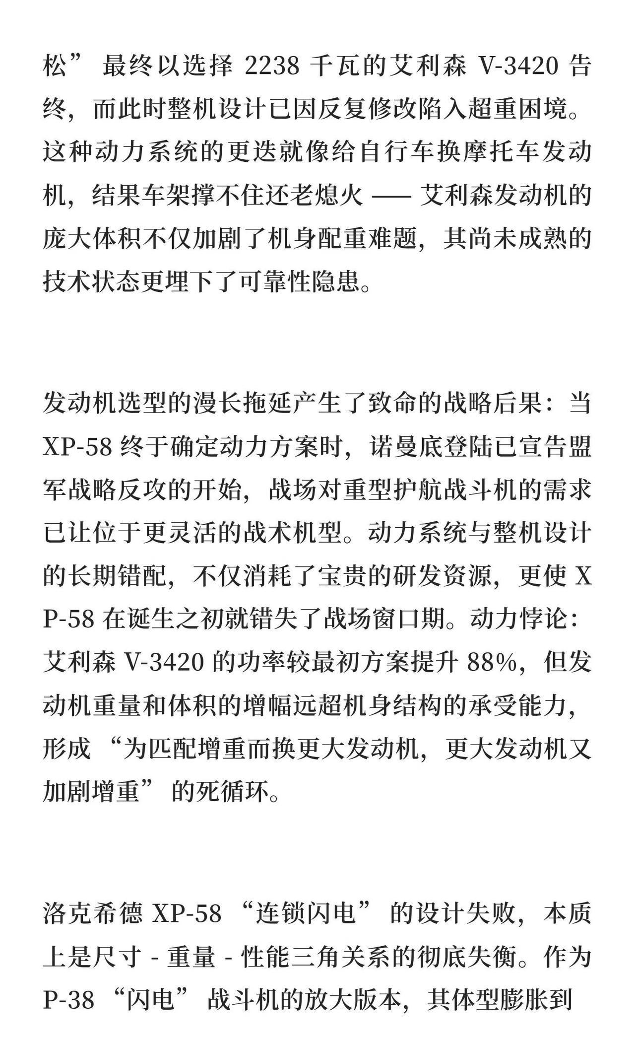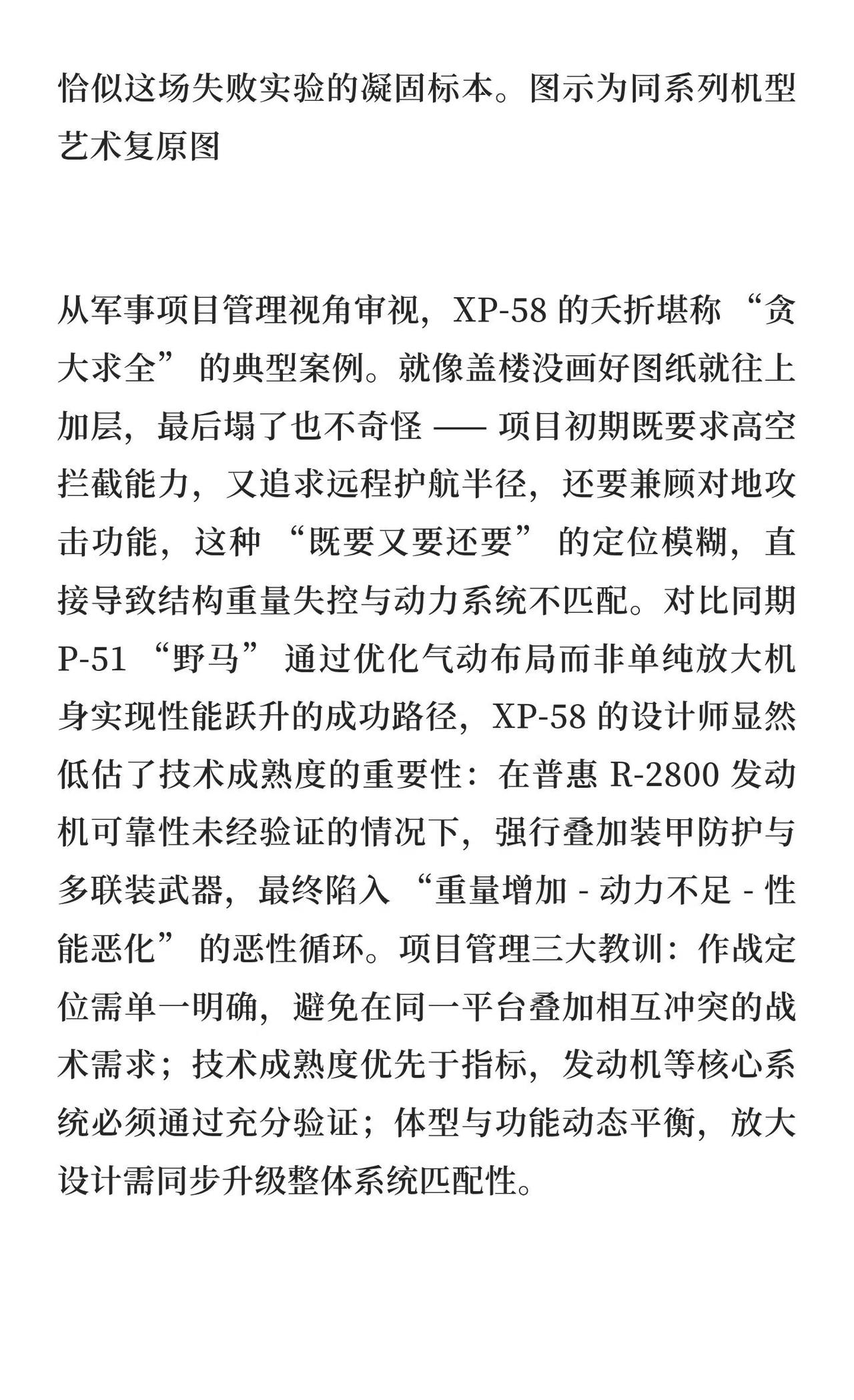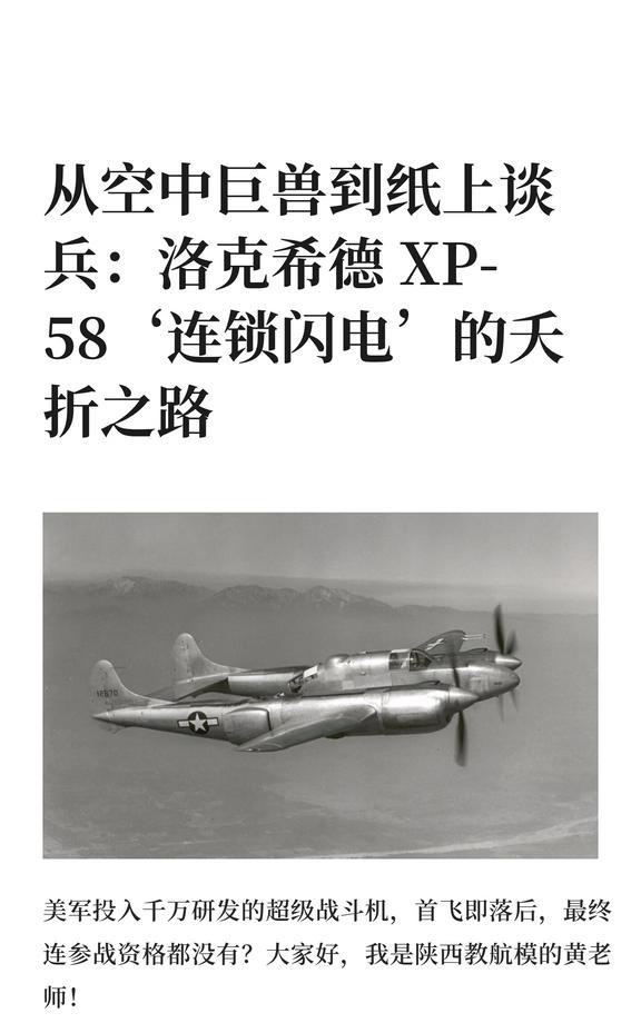 从空中巨兽到纸上谈兵:洛克希德 XP-58‘连 洛克希德XP-58“连锁闪电”因设计缺陷和战场需求错位,最终未能参战。其体型庞大、性能不佳,武器系统反复变更,动力系统选型拖延,最终因技术成熟度不足和战场需求变化而失败。航模黄老师 一起看飞机 航空航天 武器装备 军事 战斗机 机械设计 人类文明进程
