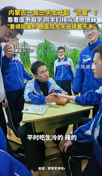 “解释不清了!”内蒙古一高三男生,因为家里留下基本医书,竟然无师自通,学会了给人把脉,班里同学和老师都找他把脉,同学:他说的话和医院专家说的差不多! 近日一名高三男生因“自学把脉”在网络上走红,引发不少关注和讨论,事情的起因并不复杂,却颇具戏剧性,这个男生并非医学世家出身,也没有拜师学艺,只是因为家中留下了一些基础中医书籍,在长期翻阅和实践中,逐渐掌握了把脉的基本方法。 据介绍,这名男生家里原本存放着几本与中医相关的书籍,内容多为常见脉象、体质判断以及一些基础理论,起初,他只是出于好奇翻看,觉得中医讲究整体观念,与课本里的知识很不一样。 慢慢地,他开始对脉象产生兴趣,尝试按照书中的描述,对照家人的脉搏进行判断,时间一长,他对浮脉、沉脉、快慢脉等概念有了直观认识。 真正让这项“技能”在学校传开的,是一次偶然的经历,班里有同学感到身体不适,随口提起最近总是乏力、睡眠不好,这名男生便尝试着给对方把了把脉,说出了一些与作息、压力相关的判断。 没想到,对方后来去医院检查,医生给出的建议与他的判断有不少相似之处,消息在同学之间传开后,越来越多的人开始找他“试一试”。 不仅是同学,就连部分老师也抱着好奇和玩笑的心态让他把脉,他通常只说一些与疲劳、作息、饮食相关的情况,并反复强调自己只是根据书本知识和感觉判断,不能替代医生诊断,尽管如此,还是有人感叹,他说的内容与医院医生的建议“对得上”,让人觉得既新奇又有点佩服。 随着相关视频和描述在网络上传播,网友评论迅速增多,有人调侃他“还没高考,先当上校医了”,也有人半开玩笑地说“直接跳过医学院了”,当然,也有理性的声音提醒,中医把脉讲究系统学习和长期实践,单靠自学和经验远远不够,不能因此就给人下结论或看病。 这件事之所以引发热议,并不在于“把脉有多准”,而在于它展现了一种纯粹的学习兴趣和探索精神,在紧张的高三生活中,一个学生因为几本旧书,主动钻研、不断实践,既满足了好奇心,也让人看到了知识带来的可能性,但正如多数网友所说,兴趣可以鼓励,专业仍需敬畏,学习的边界同样重要。 信息来源 :潮新闻