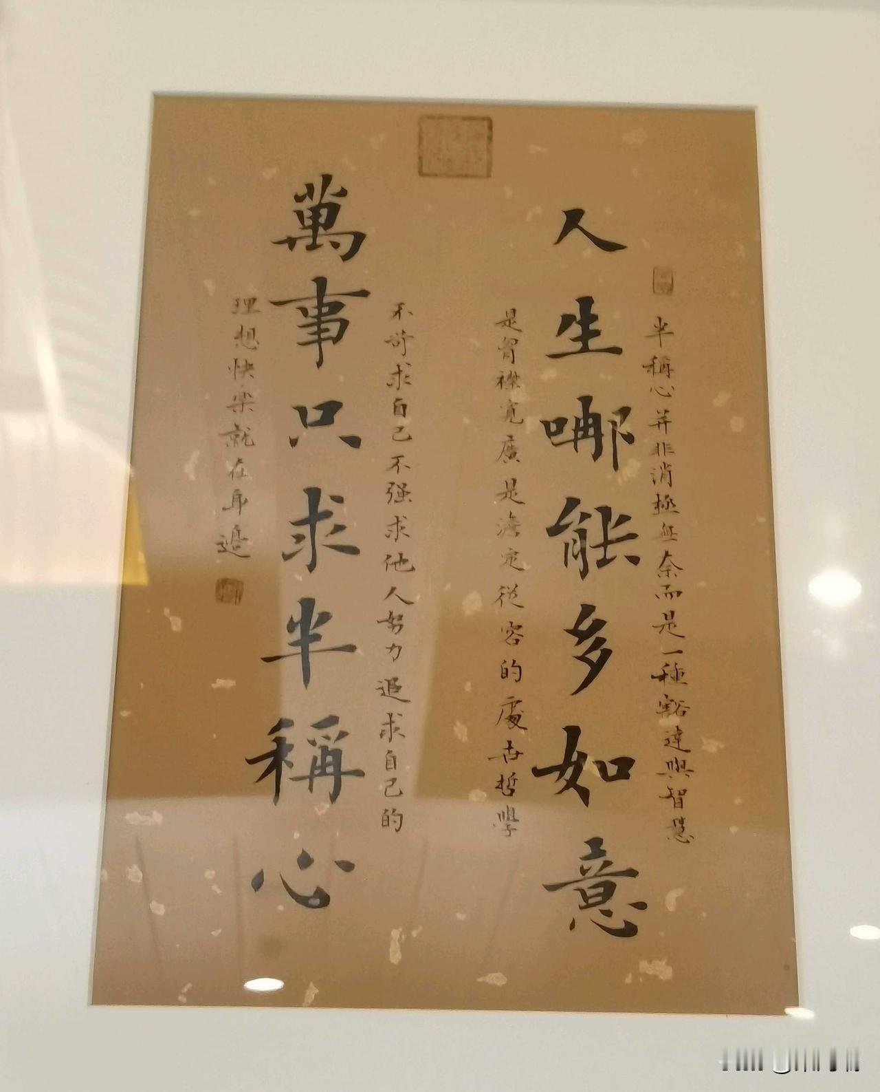 这幅作品上的内容是著名的“人生哪能多如意,万事只求半称心”对联及其阐释。这句富有哲理的话旨在劝诫人们保持知足常乐、豁达从容的心态。 对联出处与含义 出处: 这副对联最著名是挂在杭州灵隐寺内,被誉为“中国人所发现的最健全的生活理想”。 含义: 寓意人的一生不可能事事完美、尽善尽美,总会有遗憾。只追求一半的如意和称心,并不是消极无奈,而是一种胸襟宽广、淡定从容的处世哲学和人生智慧。它教导人们不苛求自己,不强求他人,知足常乐,才能活得更坦然、更健康。 这幅作品中的小字部分正是对这一思想的延伸解读。